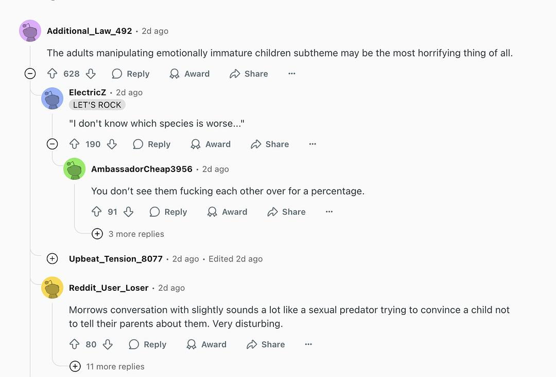 1楼:【成年人操纵情感不成熟的孩子——这条副线可能是剧里最恐怖的内容吧】