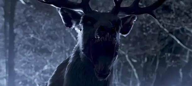 开局Uber司机被突然冲出来的畸变巨鹿撞翻车,怪物脸盆大的蹄子缓缓踱过来,后视镜闪现枚硕大浑浊的眼珠……理解镜头试图营造出恐怖逼近心脏被缓缓勒紧的压迫感,实际呈现的效果是,巨鹿的头颅做工有点假,忍不住走神思考此处是特效还是道具。巨鹿抬起蹄子在翻过来的车底盘用力跺脚,司机惨叫,后座母子俩提供惊恐表情,以上重复循环……一段过于冗长以至于显得巨鹿力道不足的践踏桥段之后,司机终于被隔车踩得无声。