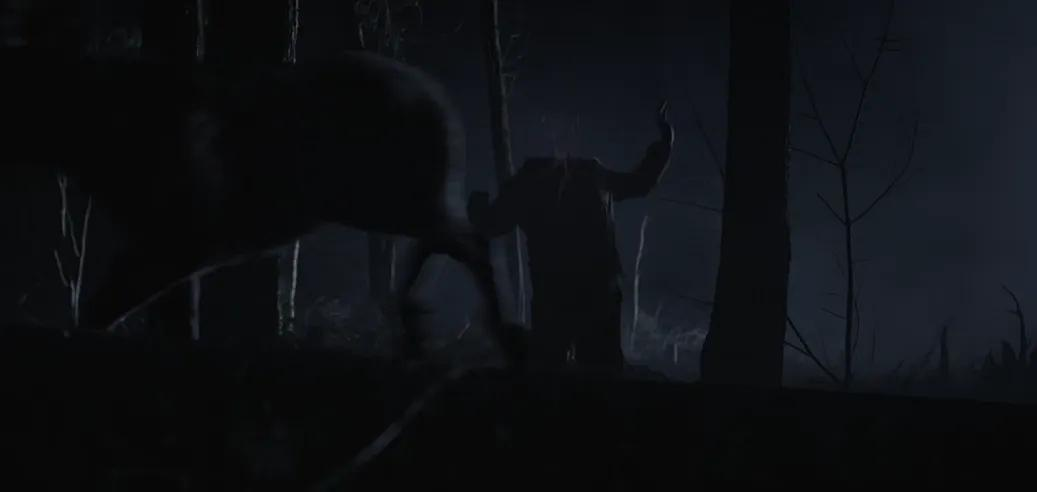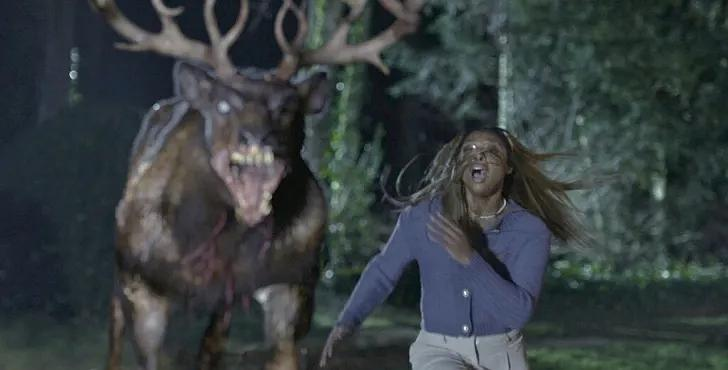 整部影片就是一头黑化变异的暴恐巨鹿,疯狂追杀一组傻大胆又神经兮兮的家庭成员。开头用了三分半钟的剪影动画,来回味经典童话《小鹿斑比》以及被追猎、被残害的黑化背景。