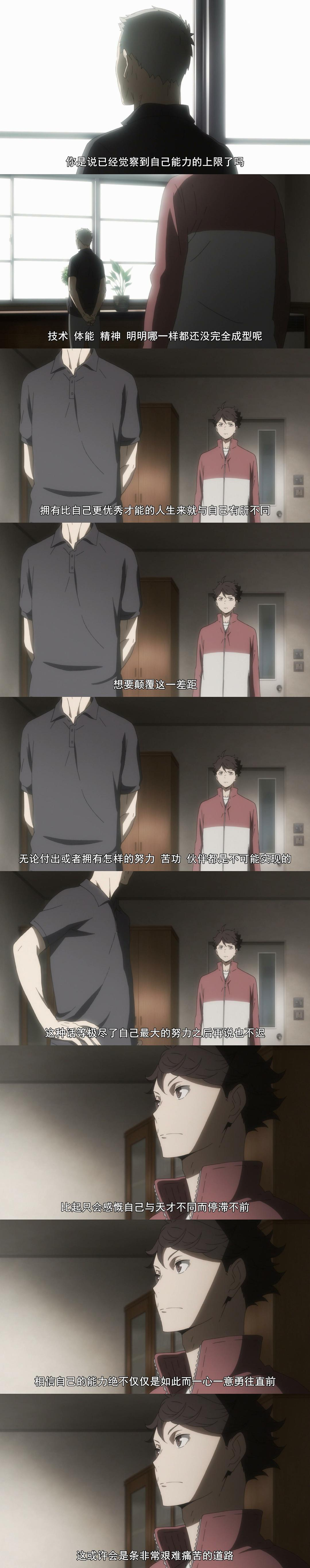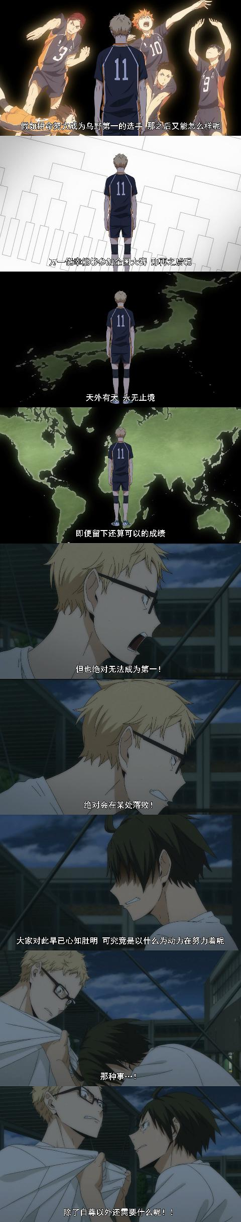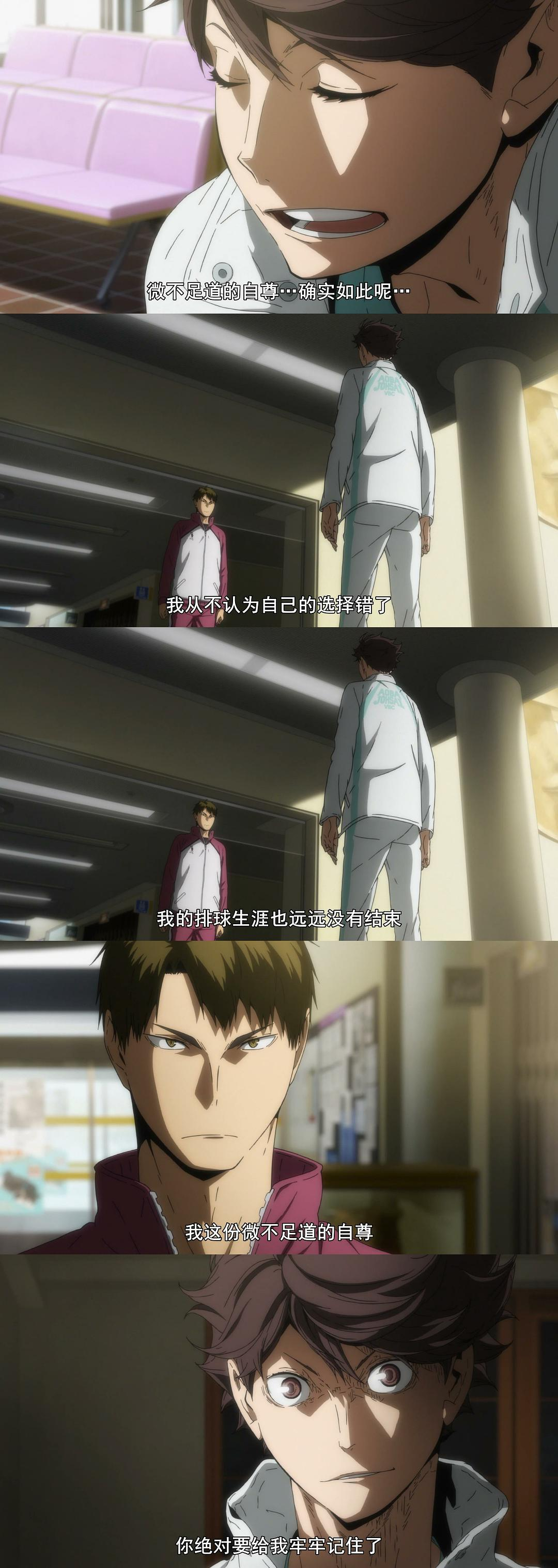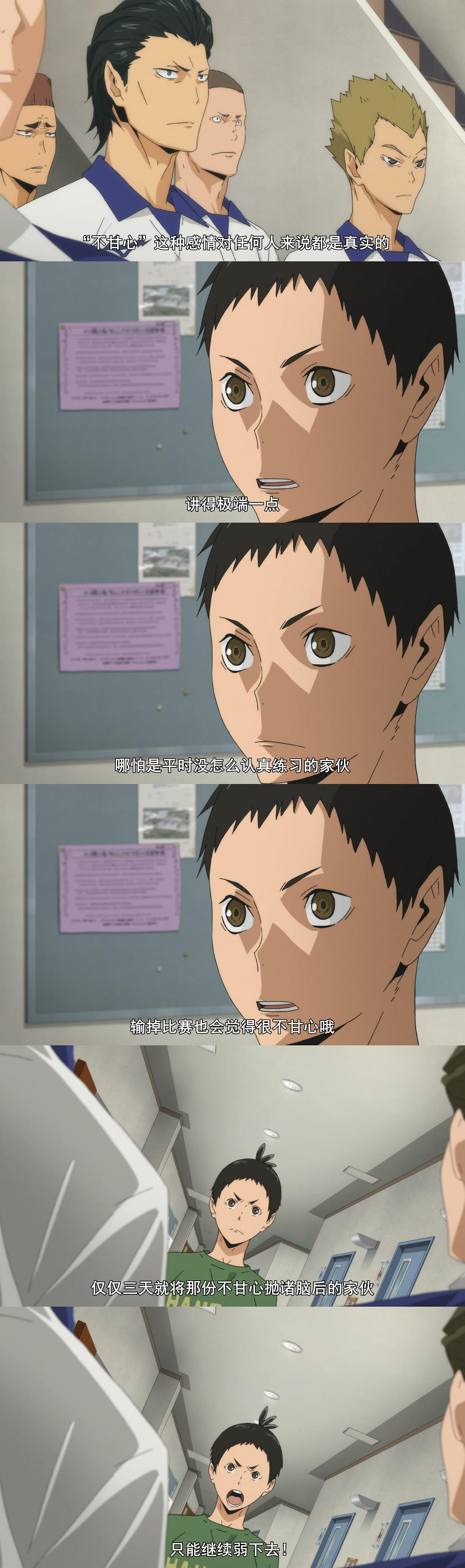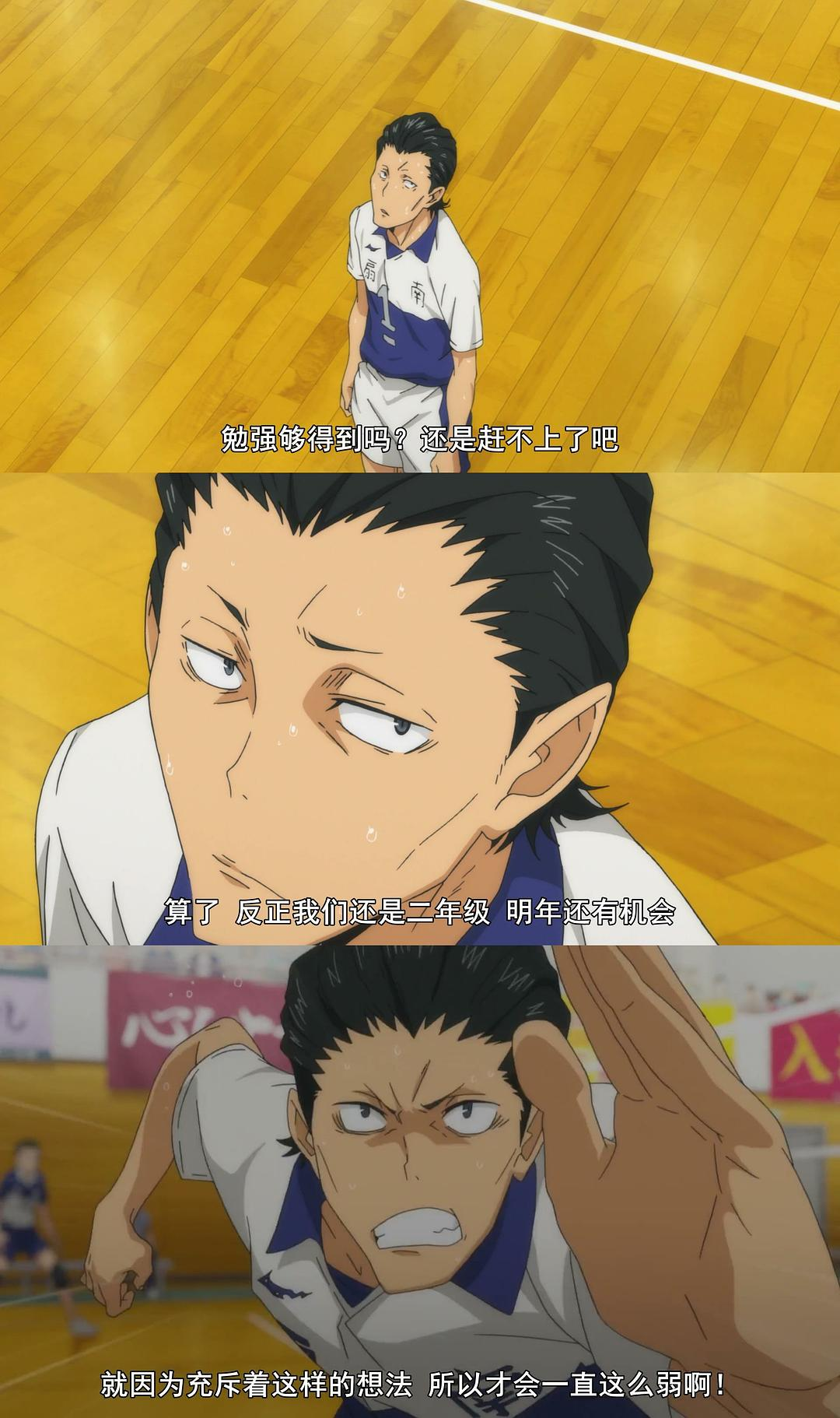 在主角队乌野的几场比赛中,当乌野赢下比赛时,并没有把重点放在主角队的欢呼和兴高采烈上,而是把更多的戏份给到了对手—失败者。让我们看到了他们的不甘和对于胜利的同样的执着。这也是小排球更能引起观众共鸣的一个地方,因为你我的道路往往都不会那般平坦,而是更多在失败中挣扎,彷徨。