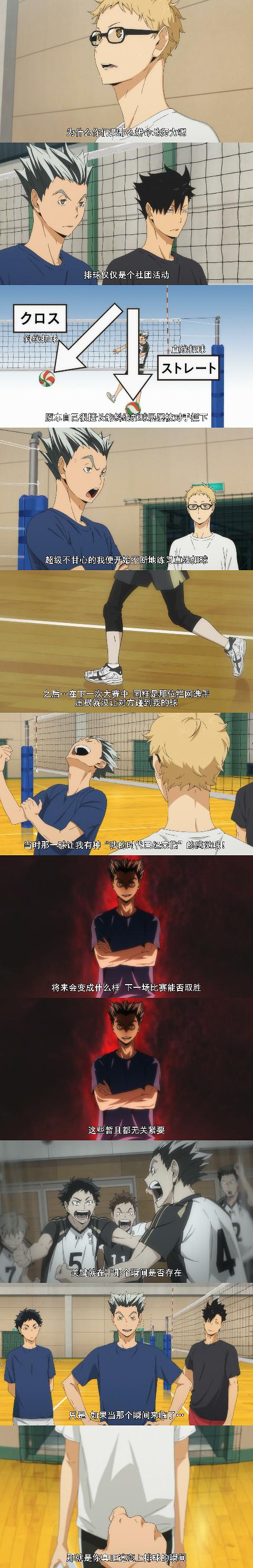 《排球少年》中的主角日向翔阳有着看似逆天的弹跳和绝对悲催的身高,他需要比别人付出更多的努力才能做到别人轻而易举可以做到的事,他苦练技艺,配合队友,好胜心强烈却缺乏自信,除了那份对排球的极度热情,他普通得和我们身边的同学没什么两样。没有任何光环和血统加成。主角尚且如此,就更不用说其他人物了。