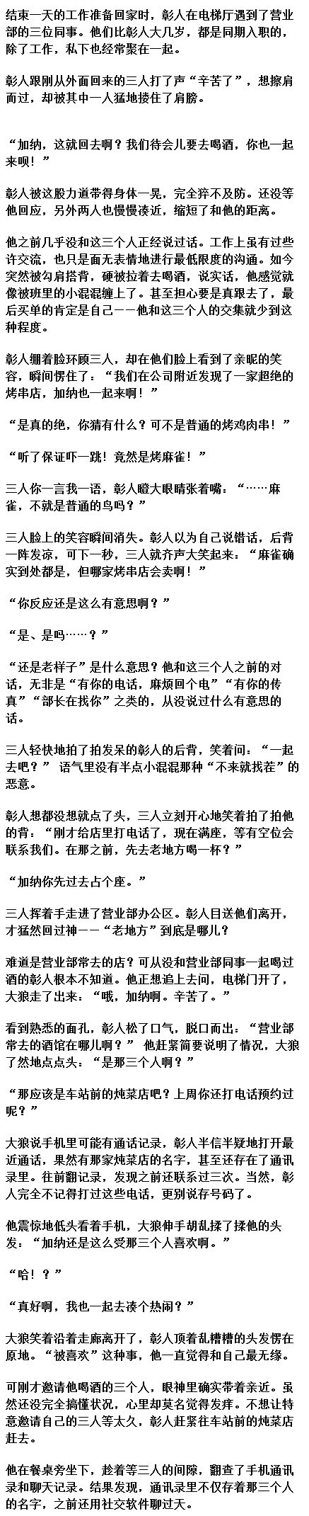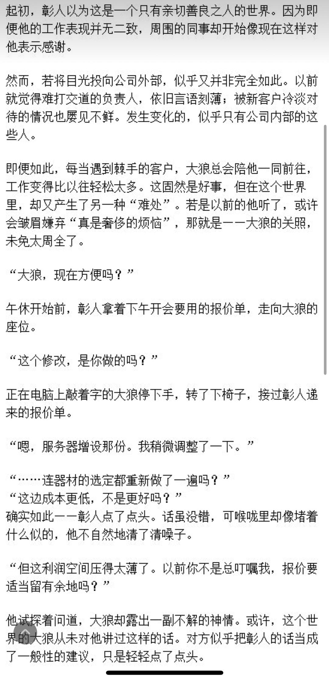 n4.小说大狼出差回来以后,加纳和大狼又爆发了小规模的争吵。加纳和大狼自我贬低,说富冈曾经说过他的职位被人瞧不起。大狼接话说自己指责过富冈了,提到加纳的努力大家是能看见的。加纳察觉出,大狼是特意出差后回公司找他的。
