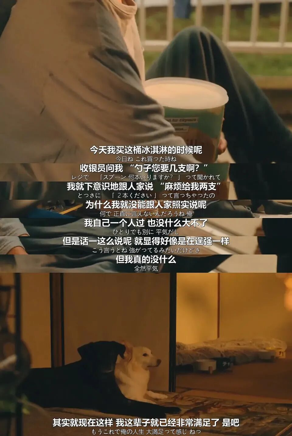 十分感谢小夸夸一夸老师的双语翻译nn我们家nぼくたちん家nnEP01nn波多野玄一:n那张纸会不会 n也像您的预订单一样n是给自己一个盼头用的呢?n作田索:n不 n那倒不是那个意思n毕竟也登不了记 n那张纸根本没什么意义n波多野玄一:n意义吗?n作田索:n毕竟我们根本没办法结婚嘛 n根本没意义的n波多野玄一:n其实呢 n我先前也还去了一趟婚介所n作田索:n结不了还去?n波多野玄一:n对 n话是这么说n但确实是有那种 n面向咱们的n我就是出于好奇心 n带着一点小兴奋 n就去了人家婚介所n但是 n那边的对象资料上 n照片里的人脸全都打上了马赛克n给人感觉保密措施是挺到位的n这一点确实是挺值得感激的n但怎么说呢…n我就是觉得 n我们这种人 n终究还是被当成不存在 n被别人藏起来n我在想也许我们 n以后只能这样活下去吧…nnn楠萤:n你们亲嘴吗?n波多野玄一:n啊?n楠萤:n亲嘴 n你们也会正常亲嘴吗?n波多野玄一:n喂…n楠萤:n您跟人是怎么亲嘴的?n波多野玄一:n我说 n这一类的问题 n正常来讲 n你也不会问别人的吧?n不会问别人的问题 n随便就拿过来问 n这可不太合适啊n楠萤:n但我这是第一次碰见这样的人嘛n波多野玄一:n也许这可不是第一次了啊n据说每一百个人里面n就有一两个人是这样呢n没准你们学校里面就有啊n无非是你自己看不出来罢了 是吧nn楠萤:n哦n那就跟发旋一样啊n波多野玄一:n发旋?n楠萤:n发旋自己虽然看不见n但还是存在的n这其实是一个道理的n波多野玄一:n发旋n楠萤:n真是抱歉n波多野玄一:n咦 抱什么歉?n楠萤:n之前您默认我父母都在n就那样问我n我其实明明就很不舒服n但是今年我问您的这些n跟那也没什么两样nn波多野玄一:n那个 那我也向你道歉啊…n楠萤:n做GAY会痛苦吗?n波多野玄一:n啊?n呃…n那你痛苦吗?n楠萤:n那你觉得做GAY挺好的吗?n波多野玄一:n嗯 这个…n我也希望自己觉得做GAY是件好事啊n楠萤:n那您该怎么办呢?n波多野玄一:n什么怎么办?n楠萤:n该怎么样n您才能觉得做GAY是件好事呢?n波多野玄一:n嗯?n嗯…n那就“恋爱和革命”吧nn波多野玄一:n那就本垒打冰棍吧n那个冰棍n竹签能抽奖n楠萤:n哦n波多野玄一:n我们以前总一起吃本垒打冰棍的…n跟我第一个喜欢上的男生一起吃n楠萤:n啊?n波多野玄一:n我们就一起吃好多好多根n但是我一次都中不上奖n像这种倒霉的时候呢n人不都说n就是平时的德行不好嘛?n我当时还信以为真了n我在想n啊 我之所以中不了奖…n是不是 就是因为我喜欢上了男生呢…n因为这是不应该的事情n所以说老天才不让我中奖的n我心里面 n一直都很不自在n我以前总觉得n喜欢别人n和别人交往n和别人一起生活n一起吃冰淇淋n全都是不应该的n都是连渴求都不能渴求的n明明根本也不可能是这样啊n但我哪怕到现在n我感觉我潜意识里n还会那么去想n虽然我已经习惯了放弃n这样一路走到今天n但是 咱们现在不就在一起吃冰淇淋嘛n嗯(挖了一勺冰淇淋吃)n自己想要什么n要是不努力争取的话n这辈子都是得不到的啊n我决定要去争取争取我想要的东西了nnnEP03nn作田索:n对不起啊n楠萤:n啊n作田索:n是我让你撒谎了n楠萤:n这事倒不能怪您n作田索:n我其实没有爸妈 而且还喜欢男生n楠萤:n咦?n作田索:n我就会编出个爸妈 n编出个女朋友什么的n然后跟朋友讲n但这样真的是挺累的n为了能自圆其说呢n我还把我编出来的这些设定n全都记在本子上n但是n像我跟谁 都说过什么之类的n这些我都完全分不清楚了n所以我也就再也不瞒着我的事了n楠萤:n可是 学校那边呢 大家都不知道吧?n作田索:n我不会特意隐瞒n我只是会选择信任的人来坦白而已n楠萤:n这样啊n作田索:n所以 对不起n撒谎骗人会有多累 我是知道的n楠萤:n那 波多野桑他也…n作田索:n嗯 他知道n你为什么找波多野先生来假扮你爸爸呢?n楠萤:n啊?n作田索:n因为你们住同一栋公寓吗?n因为他是GAY吗…n楠萤:n因为我觉得 我们挺像的n作田索:n你们像?n是说长相吗?n楠萤:n不是n是我们都在努力地活着nnnnEP04nn作田索:n其实对于我来说 那一根胡子n就是我喜欢上别人的唯一证明n当时哭得好惨n搞得我周围的这些大人们都很头疼来着n其实那根胡子一没了n我也就觉得n好像喜欢过那个人的自己n也跟着消失了一样n波多野玄一:n不过呢 说一样东西“没了”n那其实还是说明它曾经“有过”嘛n作田索:n嗯?n波多野玄一:n那根胡子曾经确实存在过的n所以说您的那份初恋n也确实是存在过的啊nnn市谷仁:n你也无非就是受人之托吧?n波多野玄一:n我确实就是受人之托n市谷仁:n那你就敢给别人装爸爸n你脑子是怎么想的啊?n波多野玄一:n我只是想做好我现在能做的事情n市谷仁:n啊?n波多野玄一:n您先前不是说n自己不能好好当个爸爸n其实我也是n有好多做不到的事情n其实归根结底n我都觉得我做不到的事情n比别人还要多啊n所以呢n我就只能每天去做自己力所能及的事情了n这样的话n我就会觉得生活其实也挺好的吧n市谷仁:n“挺好的”?n波多野玄一:n怎么说呢 就是觉得活着…n就是觉得活着其实也挺好的吧n市谷仁:n“力所能及”的事是什么事啊?n波多野玄一:n比如每天出门溜溜狗啦…n笑着和人问好啦…n比如给人让路啦…n再比如说 放生一条虫子啦n市谷仁:n啊?虫子?n波多野玄一:n即便不是多了不起的事 也没有关系n只要是自己力所能及的事就行n我也推荐您n就这么一点一点坚持做下去n市谷仁:n啊?n波多野玄一:n这就算是“每个人