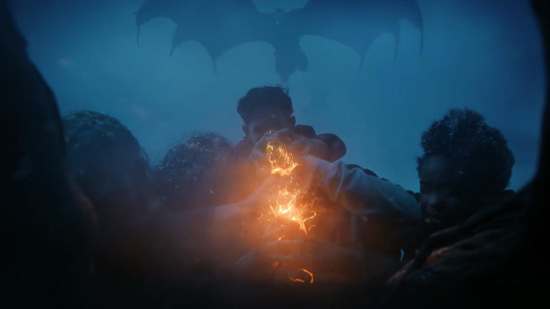 还得是《魔戒》!只不过不能完全照抄,大致的思路是:几百年前的印第安酋长之女+兽皮战衣≈德鲁伊,既然瑞奇临死前这位“德鲁伊”出现过,那么当她再出现的时候,视觉上能唤醒观众,这就够了。于是,瑞奇像“刚铎战役”里的亡灵那样,惊艳返场。这么多人塞一把黑曜石匕首实在委屈,好在有《空中大灌篮》可以参考,大伙儿一齐往下灌,终于成功。