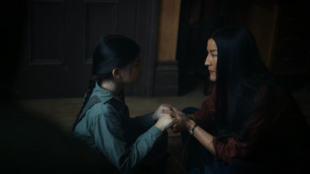 考虑到“种族恐怖”以黑人性为核心的创作脉络,《德里镇》对于这一类型最重要的贡献莫过于将原住民历史、生活方式和世界观作为全剧的关键线索。剧中最关键的一段情节出现在第四季的结尾,在哈洛伦的心灵感应下,观众“走进”原住民塔尼尔的记忆,年幼的塔尼尔坐在篝火旁聆听姑妈罗斯述说部族古老的故事,在这段信息量巨大的闪回中,殖民压迫和集体创伤缓缓浮现:故事展示了原住民(据悉原型来源于缅因州的瓦巴纳基联盟)曾试图将陨石的碎片铸造为匕首,与“它”(原住民称其为“戈鲁”)制衡以保护部落,却因为欧洲殖民者的闯入而陷入存亡危机,欧洲定居者无视族人的警告,贸然闯入禁忌之地,随着“它”的日益强大,Shokopiwah族被迫背井离乡。