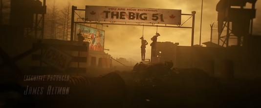 剧中结束动画呈现的应该就是一座美加边境检查站,已经被美国攻破,告示牌上写着欢迎来到小美国(Welcome to Little America),横着的牌子上写着大51( The Big51),小美国和大51都是加拿大的别称,其中大51暗示的是加拿大像是美国的第五十一个州,牌子底下被屌丝的应该是加拿大的皇家骑警。