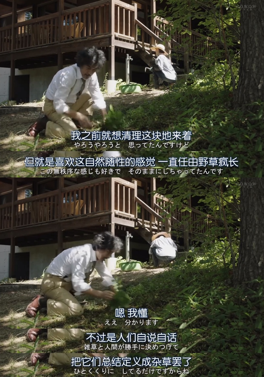 这一集谈论的话题让我想到了《心灵奇旅》。第一集里出现过的送蔬菜的山彦,迎来了他的休息日,以客人的身份来到了民宿里。进到屋子里的他,对柱子、木材和粉刷都很有研究,在后来的谈话里才得知,原来他在这份工作之前原来做过很久的建筑工作。轮换过很多城市和地方,因为手受伤停滞过一段时间的他,最终回到了早年来过的这个森林里。运输蔬菜的工作,一做就是十五年。他带着疑惑的笑容说着“我真的有在好好生活么?有时不经会有这个疑问。”