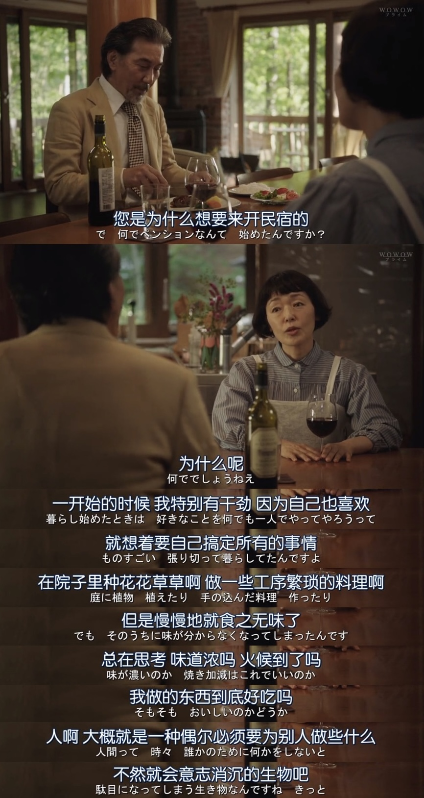 这句话和最后一话“流浪”有点相呼应,最终小林聪美选择离开了民宿,无论是心境和想法,人更多的是变化而非专一,就像剧中提到的受四季影响,很多时候因为一个人或一件事就会让原本日复一日的生活发生很大的改变,长久和永恒在时间与无常面前不堪一击。在一个地方待久了,经历会变得停滞和单调,厌倦出现,不满现状,很自然地会想要体验更多,但到头来或许也会发觉曾经舍弃的和往后想要争取的实际并没有什么实质性的差别。