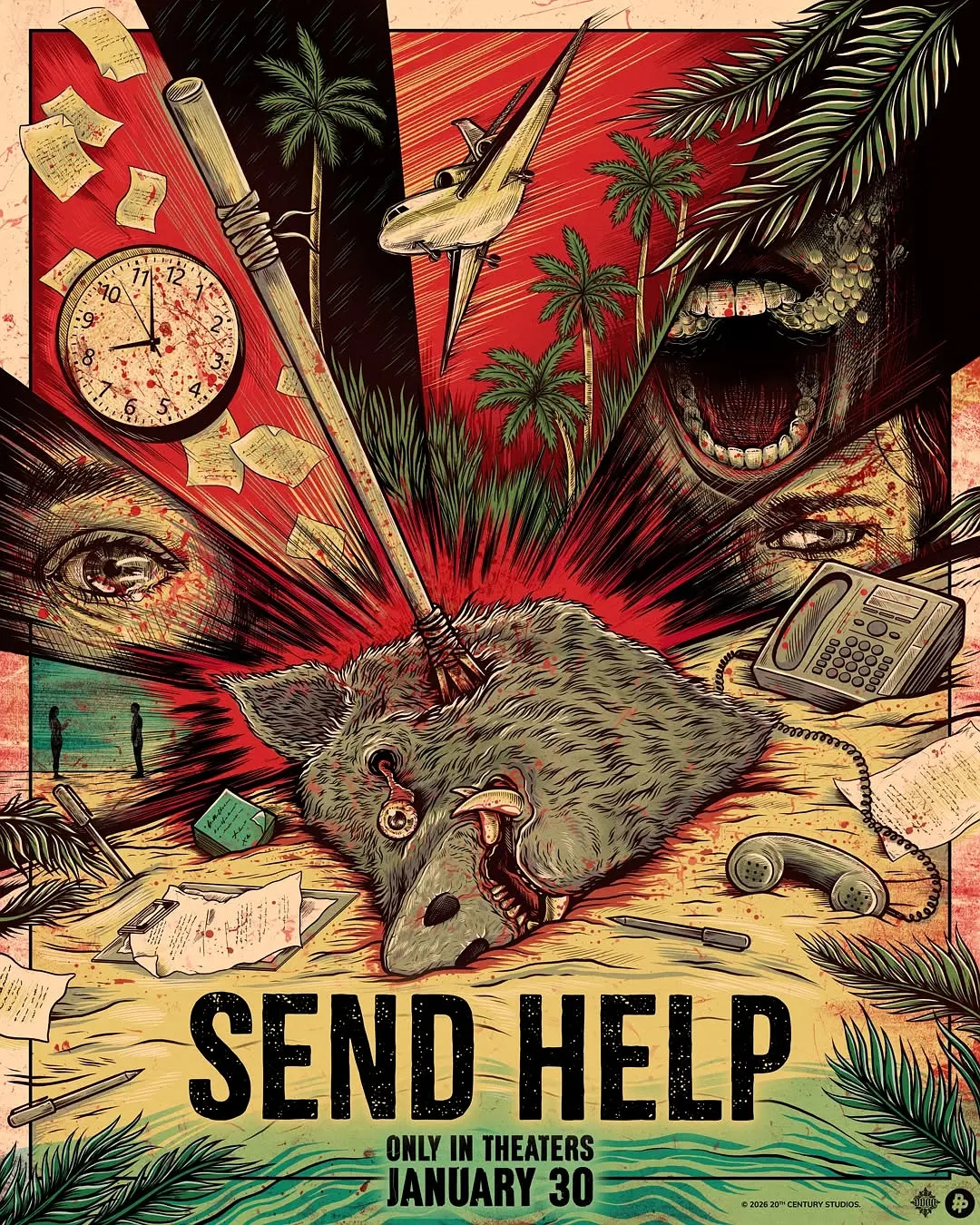 在这一系列阶级复仇的拼图中,山姆·雷米2026年的《请求救援》提供了又一个血浆四溅宣泄的渠道。相比《悲情三角》冷峻的社会观察,雷米将叙事彻底推向了“动作寓言”。他抛弃了知识分子的说教,利用标志性的“暴力喜剧”风格,将职场上的不公待遇直接转化为肉体上的你死我活: