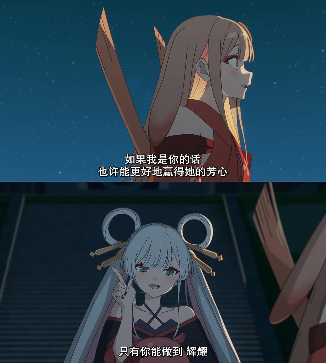 3、看宣传片最有歌姬感的是八千代,以为八千代是辉夜姬呢,结果看了电影发现黄毛是辉夜姬。剧情最后黄毛回到月球,被女主的歌声所唤醒,重回地球成为了八千代,这个设定挺巧妙的,竟然这样圆回来了,黄毛=辉夜姬=八千代,这也解释了为什么一开始女主他们被挑战了八千代就直接冲上来帮忙了,也算是因果循环吧。