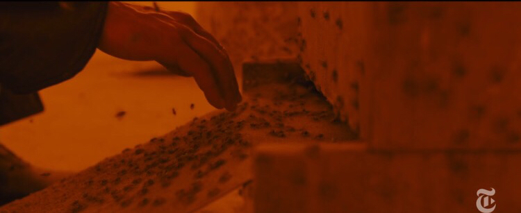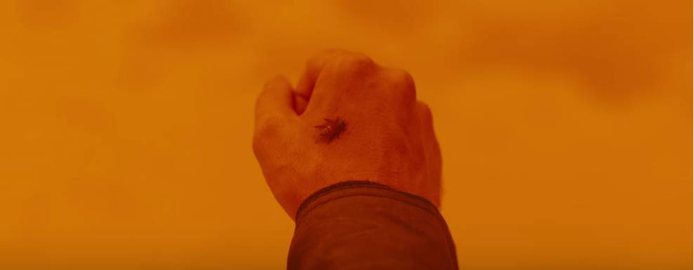 电影在中后期,k为了找寻德卡,孤身一人(joi不算是人)进入了受核辐射污染而无人居住的赌城之中,而在那个以橙黄色统领的世界之中,他发现的唯一一个生命迹象,竟然是一群蜜蜂。