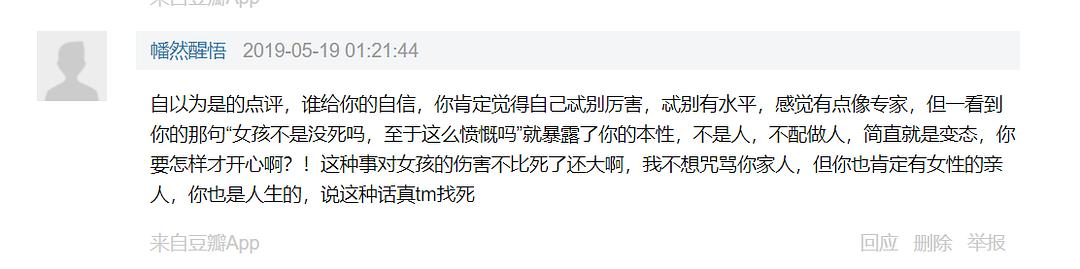 制作人想要传达的愤怒和悲痛全都入不了豆瓣的技术达人们的眼,他们理性尖锐、阅片无数,拥有上帝视角,他们只觉得剧情冗长、手法肤浅、配乐鸡肋,甚至觉得母女深情狗血。点进去大部分都是男的在说这样的话。