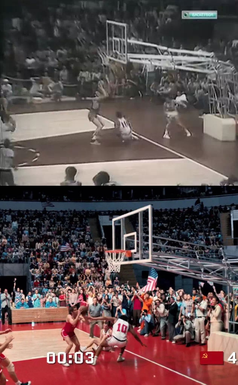 比如频频出现的扣篮镜头,其实在那个年代并不多见,甚至因被视为对对手的不尊重而不被鼓励。比如在如此高水准的决赛当中,两队的技战术素养基本没有被过多赞美,而是稍嫌简单地将美国的战术暗示为摔跤,将苏联的战术暗示为拼命。