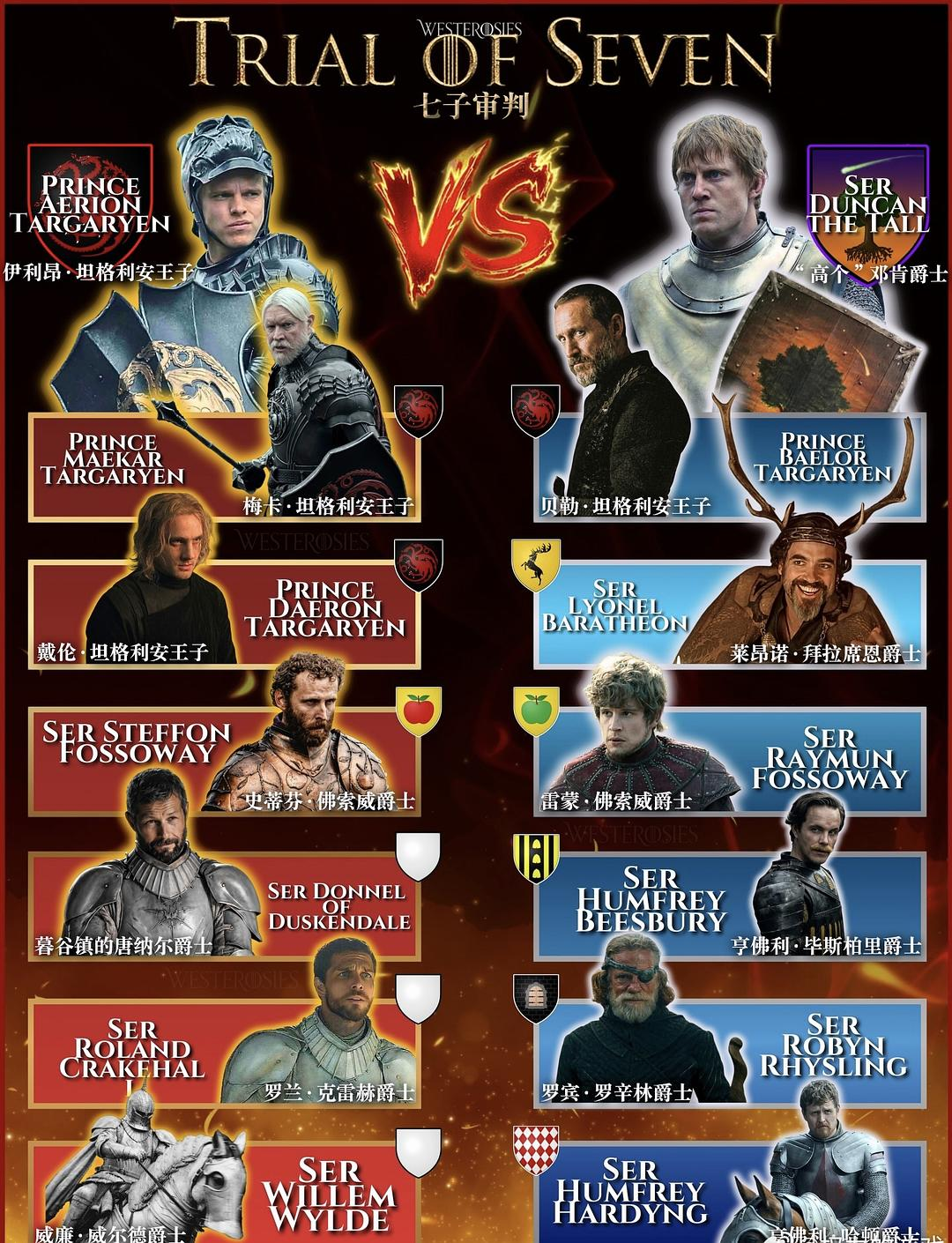 n左方阵容nn1. 伊利昂·坦格利安王子 (Aerion Targaryen)nn2. 梅卡·坦格利安王子 (Maekar Targaryen)nn3. 戴伦·坦格利安王子 (Daeron Targaryen)nn4. 史蒂芬·佛索威爵士 (Ser Steffon Fossoway)nn5. 暮谷镇的唐纳尔爵士 (Ser Donnel of Duskendale)nn6. 罗兰·克雷赫爵士 (Ser Roland Crakehall)nn7. 威廉·威尔德爵士 (Ser Willem Wylde)nn右方阵容nn1. “高个”邓肯爵士 (Ser Duncan the Tall)nn2. 贝勒·坦格利安王子 (Baelor Targaryen)nn3. 莱昂诺·拜拉席恩爵士 (Ser Lyonel Baratheon)nn4. 雷蒙·佛索威爵士 (Ser Raymun Fossoway)nn5. 亨佛利·毕斯柏里爵士 (Ser Humfrey Beesbury)nn6. 罗宾·罗辛林爵士 (Ser Robyn Rhysling)nn7. 吉佛瑞·哈狄恩爵士 (Ser Gwayne Gaunt)