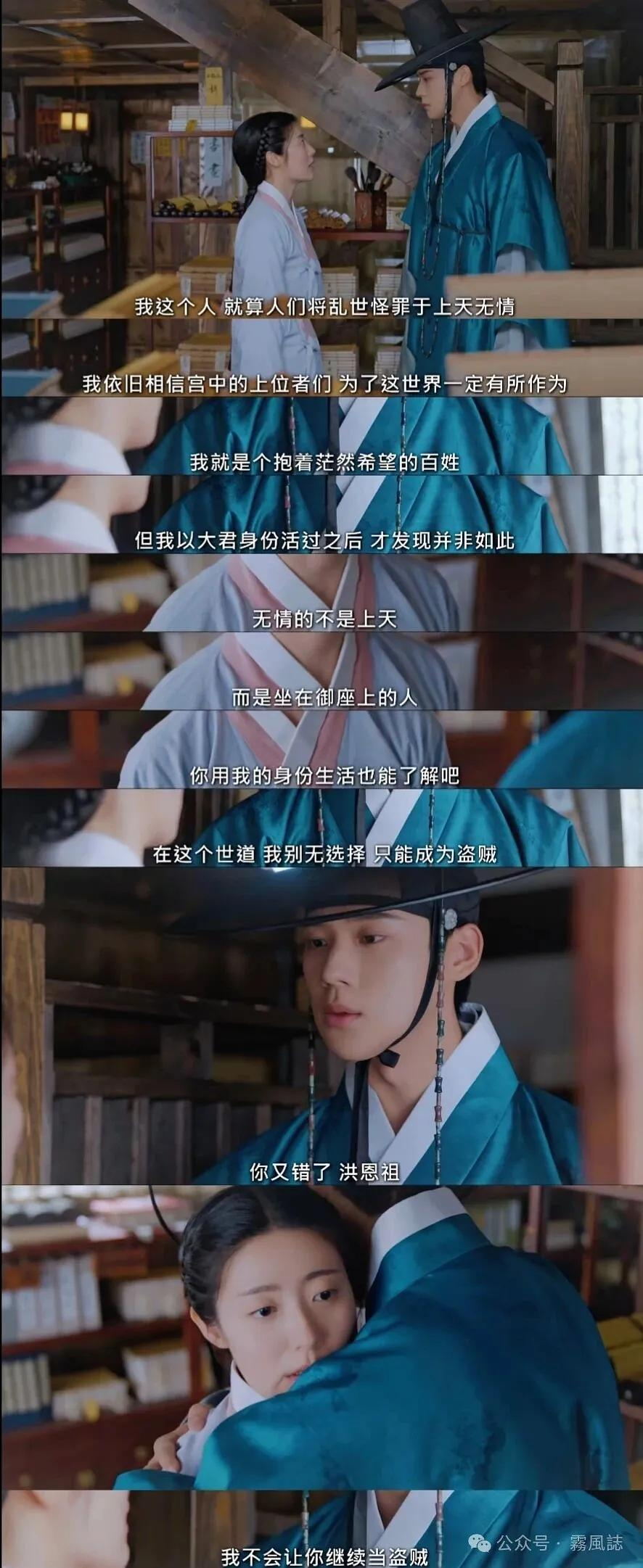 剧情前半部分偏重浪漫氛围,“灵魂互换”打破身份阶级壁垒,让恩祖和大君相互理解、相互拯救,成为真正的命运共同体,推进后半段的主线——围绕历史上的“中宗反正”事件,用理想化的方式拨乱反正,打造一个不再需要盗贼的盛世······