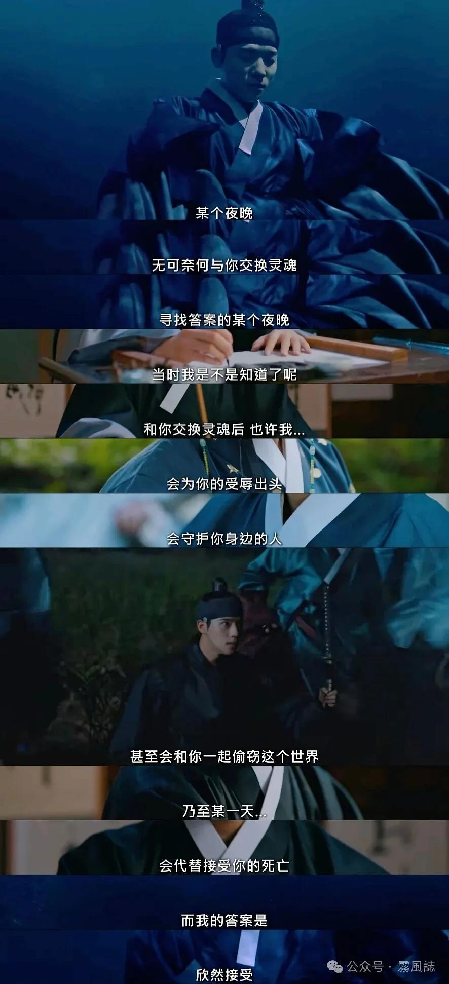 灵魂互换在这部剧里被运用的很妙的地方是还承载了更具体的叙事和情感功能:n1、打破“猫鼠”对立,重构关系:两人本是追捕者与被追捕者的“猫鼠关系”。灵魂互换后就打断了这种对立,让他们为了生存不得不直面对方的人生。制作方强调,这之后的故事才是“全剧情感与叙事的重要核心”。n2、制造独特喜剧与情感张力:虽然“灵魂互换”是经典设定,比如前面提到的《秘密花园》,但这部剧将这一设定置在古代严格的阶级社会背景下,从而产生的笑料和冲突更具反差感。例如,身为大君却要学习如何做贼,学会如何与母亲相处(大君为了保护母亲而从小封闭对母后的关心),而义贼则需驾驭宫廷礼仪,学会如何使用权力等等。n3、延迟的情感沟通与成长:值得注意的是,互换初期并未立即带来情感上的突破。前面4集所带来的男女主之间的信息差通过第5集的灵魂互换后完成了突破信息差,恩祖得以知道李烈的真实身份和成长环境,而李烈也知道了恩祖为了家人要嫁给一位病入膏肓的老人以及是义贼“吉童”的真相,通过灵魂互换共享信息,消除暗箱,这种设计延长了情感发酵的过程,让后续的和解与相爱更显珍贵。nn我很喜欢这部剧的灵魂互换设定,因为它远不止是一个制造笑料的奇幻“老梗”。它本质上是用来设置成为一个精巧的叙事工具和一副深刻的情感催化剂。平民恩祖也可以饰演好道月大君,这件事本身就是对朝鲜时代森严阶级制度的一次沉浸式审视与挑战。高高在上的道月大君,一个连衣服的结都不会打的权贵如何去亲身体验底层的艰辛,也让反抗者亲身感受权力中心的复杂与束缚。灵魂互换也让彼此更加了解对方,灵魂互换让恩祖和李烈,两个原本不可能发生的恋情创造了前提——只有当彼此真正“成为”对方,跨越身份的深刻理解与爱情才得以发生。