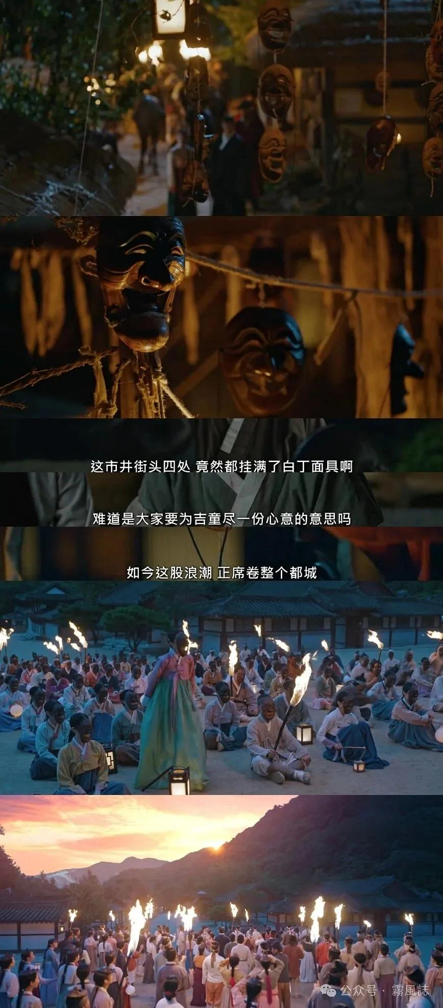 街头挂满了吉童的面具,无论是两班贵族出身的海林小姐,还是被救助过的平民百姓们,他们在那一夜放下身份品阶,戴上了一样的面具在城门口静坐,这分明是一场起义。