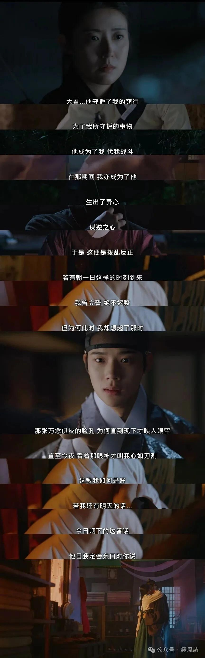 两个人正式摊牌谈谋反这一段我认为是比告白更心动的场面,这里更能表达恩祖的真心,她充分认可他这个人,如果是大君登上王位,那么她自己被利用、赴死也甘愿,恩祖对大君的情感走向以忠为爱。
