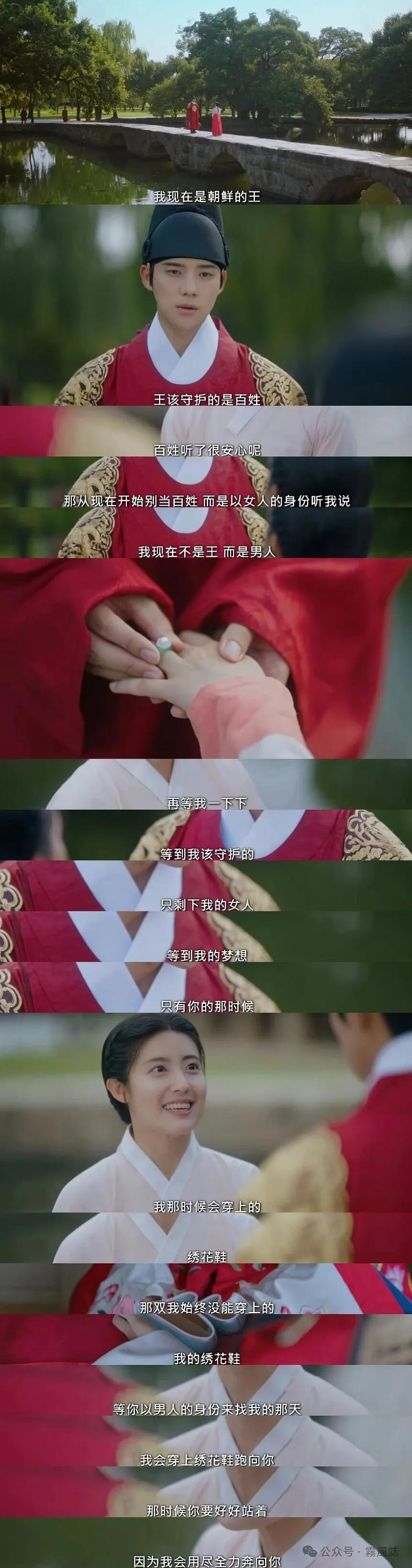 这部剧女主人设更不必多说,她是行医救人的医女恩祖,也是劫富济贫的盗贼吉童,在感情中她也始终都保持着主体性,大君也深知这一点,所以他用了“迎接”这样的词。