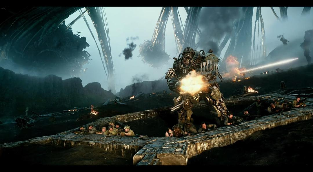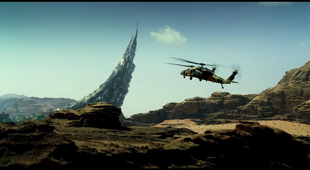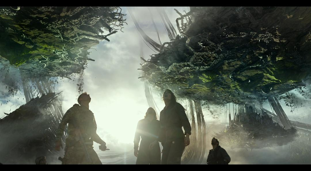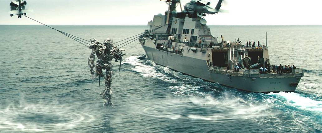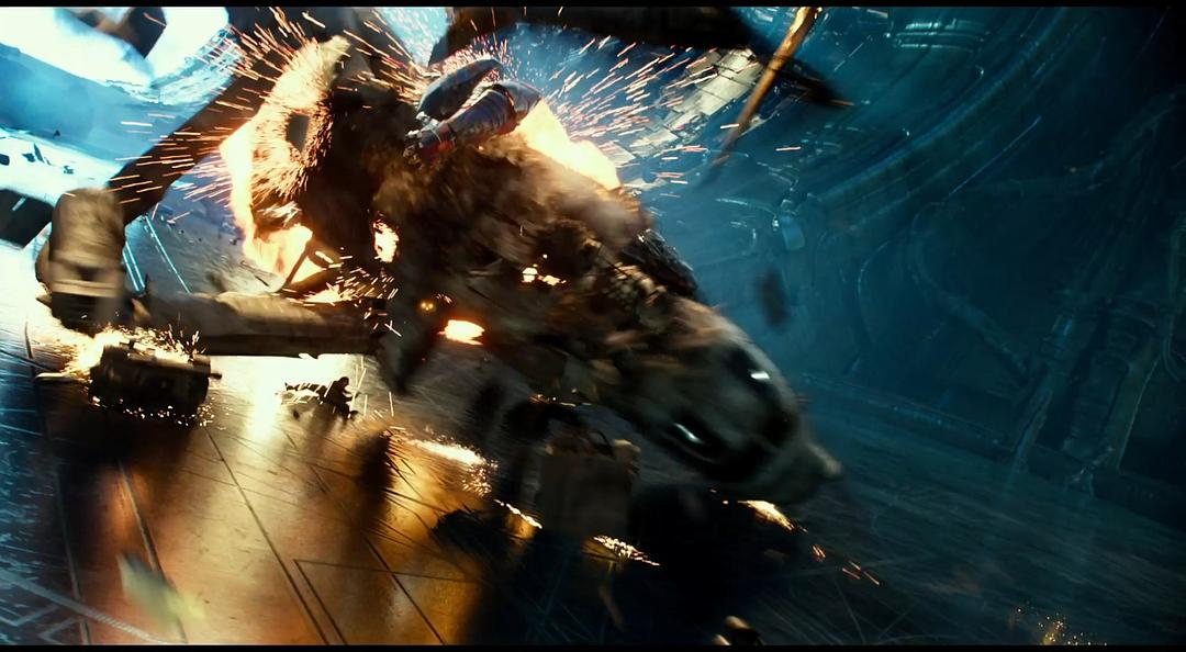 外星飞船从海中升起这段的特效也是无可挑剔,巨大场景中的海水质感表现得非常好。反例是2013年的《环太平洋》和《哥斯拉》,受限于当时的技术条件限制没法模拟非常细小的粒子,所以虽然是很巨大的机械和怪兽但是在海水中打斗的镜头看起来有点像在水池里的效果,《超级战舰》同理。《后天》和《2012》里也是同样的问题,计算机模拟的水非常失真。变5里对大场景的水的表现是一个很大的进步。另外个人非常喜欢这段,外星飞船上浮直接顶掉了一艘弗吉尼亚级攻击核潜艇,之前的潜艇战的戏也是目前最顶级的视觉效果了,变5中展现了相对前几作非常多样的战斗场景,比较期待工业光魔在《超级战舰2》里的表现。