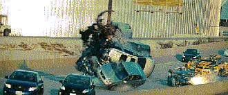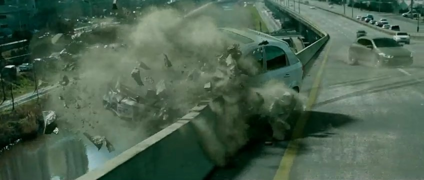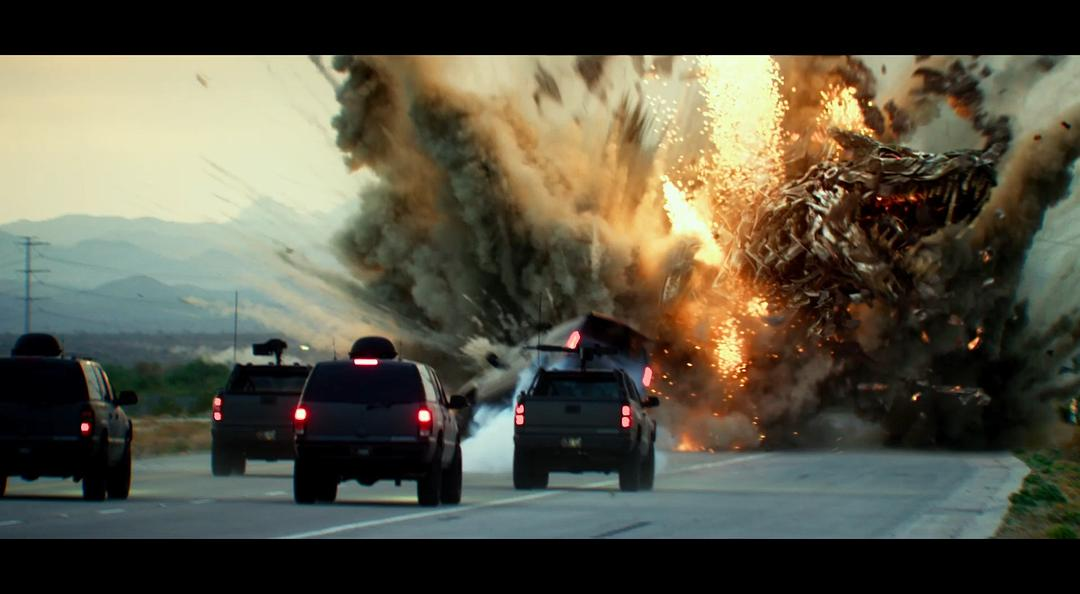 最左侧那块石头,在汽车碰撞时触发了一个滚动的运动姿态,在之后几秒的镜头中这块石头则保持着稳定姿态向左飞出。这个特效镜头之出戏完全败在失真的物理模拟上,而变5中的物理模拟几乎无懈可击。