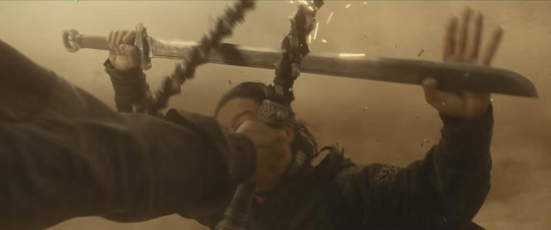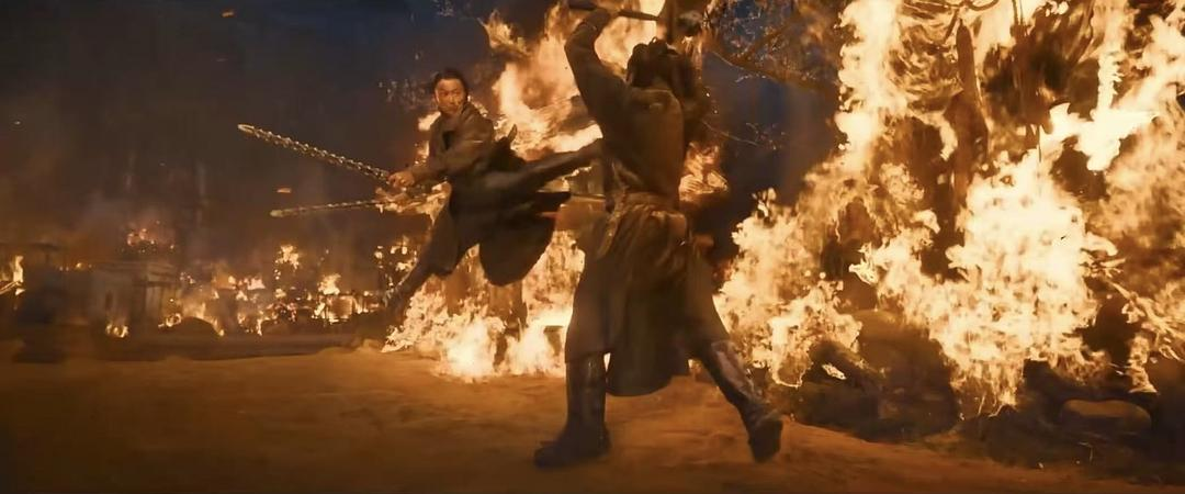 另一个让我印象深刻的武打片段是莫家集被毁后,吴京饰演的刀马和谢霆锋饰演的谛听在矮墙上对打的那场。在此之前他俩在大漠上遭遇过,当时两人都被卷在大沙暴里,一边是视野不清,一边是快把人吹飞起来的狂风,所以他俩都默契地与地面呈30度角站立,靠重力对抗风力,同时想办法把对方挑飞或踹飞。但因为刀马的武器是一把窄刀,而谛听手持两把钢鞭,刀软钢鞭粗,所以刀马在战斗中落了下风。