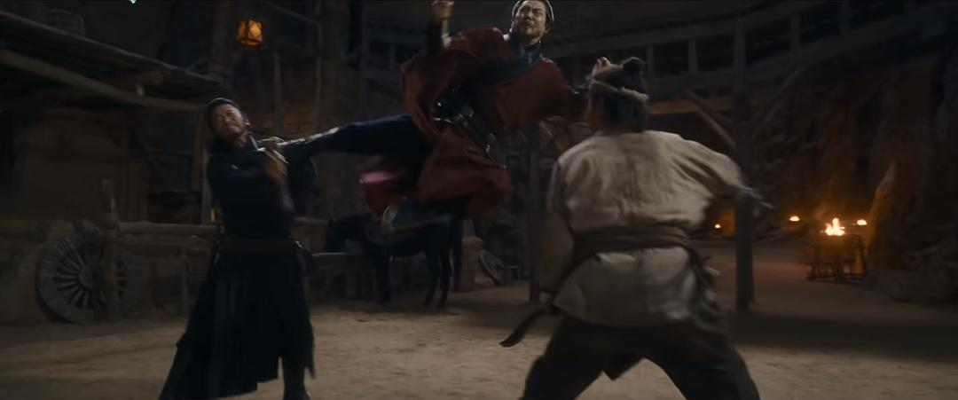 事实上也确实如此。电影中第一个好看的武打片段是吴京和张晋二对一打李连杰(这什么哥斯拉大战金刚的戏码),张晋饰演的双头蛇一开始唯唯诺诺,一见妻儿将被欺负,他抽出双刀就是干——这里有一个设计得很细节的地方,就是双头蛇多年隐姓埋名开旅馆,儿子都不知道他有这本事,可见他平时没有高强度撸铁的习惯,突然跟常贵人对打,他是不可能还有当年的水平的。而吴京饰演的刀马也点了他:“你就这点能耐?你不是双头蛇吗?”而后二对一,刀马使刀,双头蛇用暗器,两个人打得都很艰难,但看得出两个人从配合生疏到慢慢有默契的过程,而这个默契最后在双头蛇扒住常贵人的刀吃进身体,用命吊住敌人大喊刀马补刀的一瞬达到巅峰。