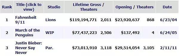 在整个北美纪录片票房榜上,[帝企鹅日记]也占据第二位。