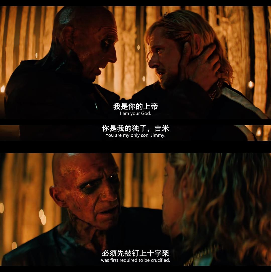 nn医生这个人物虽然在电影里是无神论者,但非常明显的设定为那个乱世中的“神”,他代表着找寻、医治、救赎。n电影1小时18分,医生在旷野呼唤参孙那一幕,多像《创世纪》里神的呼唤:“亚当,你在哪里?”n医生说,你曾迷失,又被寻回。n这也代表了基督教的真理—主动寻找,“不愿有一人沉沦,乃愿人人都悔改”。n很出人意料的剧情是,医生因为涂了碘酒被误认为“皮肤红色的撒旦”,跟参孙一起的欢乐时光被误认为与恶魔共舞。nn医生应Jimmy的要求冒充撒旦那一幕是全片的亮点,他出场的旁白引用了《启示录》13章18节:“在这里有智慧:凡有聪明的,可以算计兽的数目;因为这是人的数目,它的数目是六百六十六。”n接着伴随着铁娘子的歌—The number of the beast 一顿蹦迪。n(这一段真是非常鬼畜,医生的妆造很玛丽莲曼森,蹦迪的动作又很伏地魔,以后办摇滚音乐节可以直接抄作业了。)nn医生提出,要让世人都接受Jimmy所谓的“恩典”,必须由撒旦之子来完成献祭,即被钉于十字架。这一巧妙思路把恶人Jimmy反将了一军。nJimmy不愿上十字架,最终却被倒挂其上。这与《腓立比书 》2章8节中基督“自己卑微,存心顺服,以至于死”形成绝对反差。n电影中的十字架在此不再是救赎工具,而成为Jimmy罪的刑具。n多棒的结局,一切僭越神位者必被自身逻辑反噬。