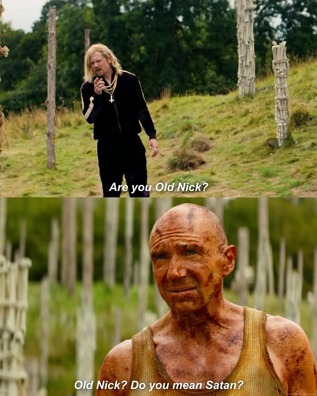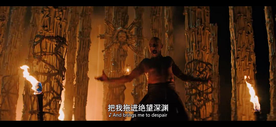 那种“干巴巴的幽默感”与“由于极度孤独而产生的自言自语”,让角色散发出一种莎士比亚的悲剧色彩。特别是那场足以列入年度最佳的、向摇滚乐队“铁娘子”Iron Maiden致敬的桥段。当“吉米”们闯入骨庙时,费因斯竟然在漫天烛光下,伴随着《The Number of the Beast》的重金属节奏疯狂起舞。