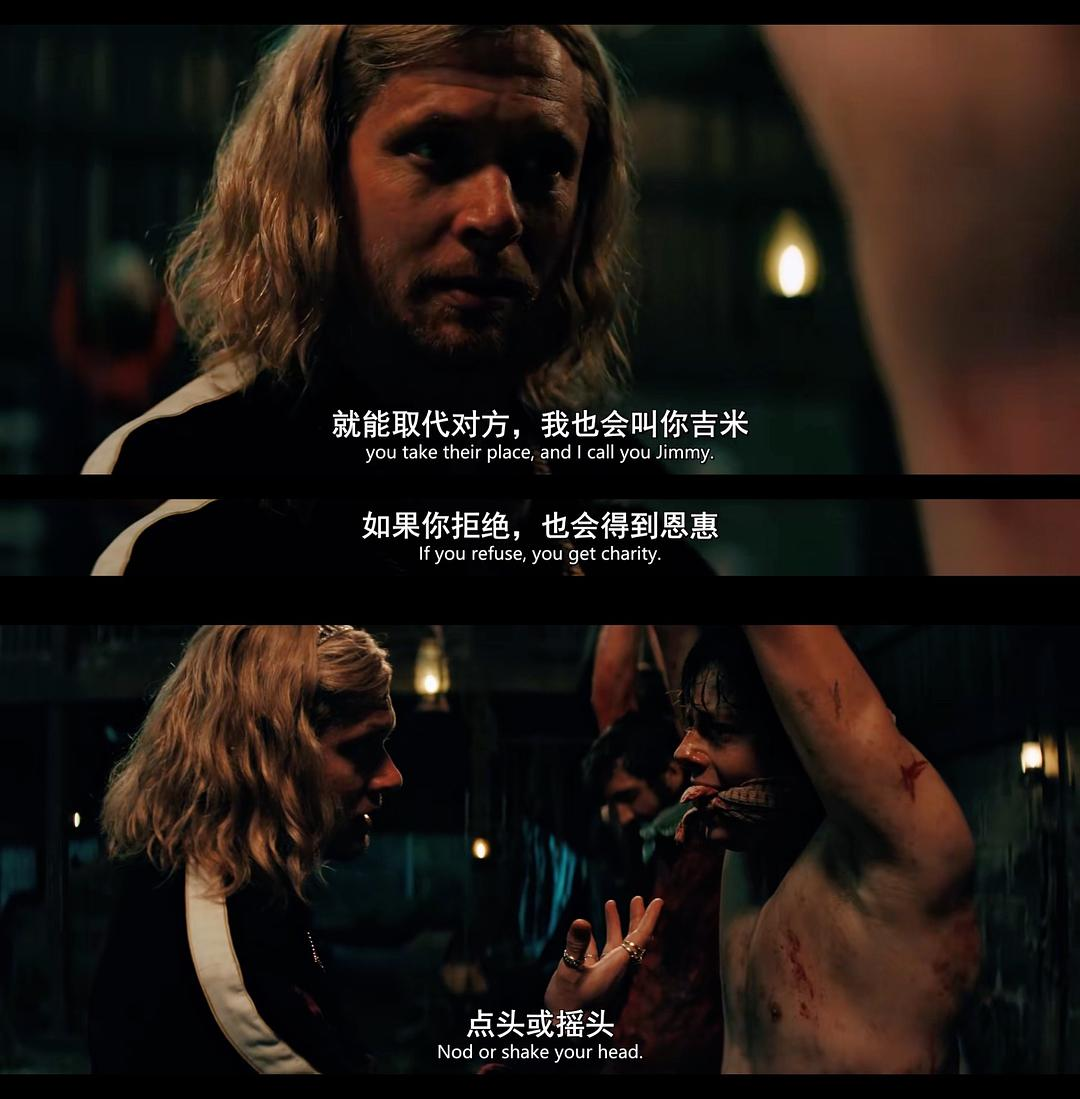 如果说萨姆森与医生的互动是温柔的,那么吉米(们)的那场令人不适的虐杀戏则是纯粹的“暴力祭典”。凯尔森博士和吉米就像一枚极其怪诞的硬币的两面,费因斯和奥康奈尔的表演赋予了他们鲜活的生命力,两人性格迥异却能量十足,面对破碎的世界,他们选择的生存方式也截然不同。