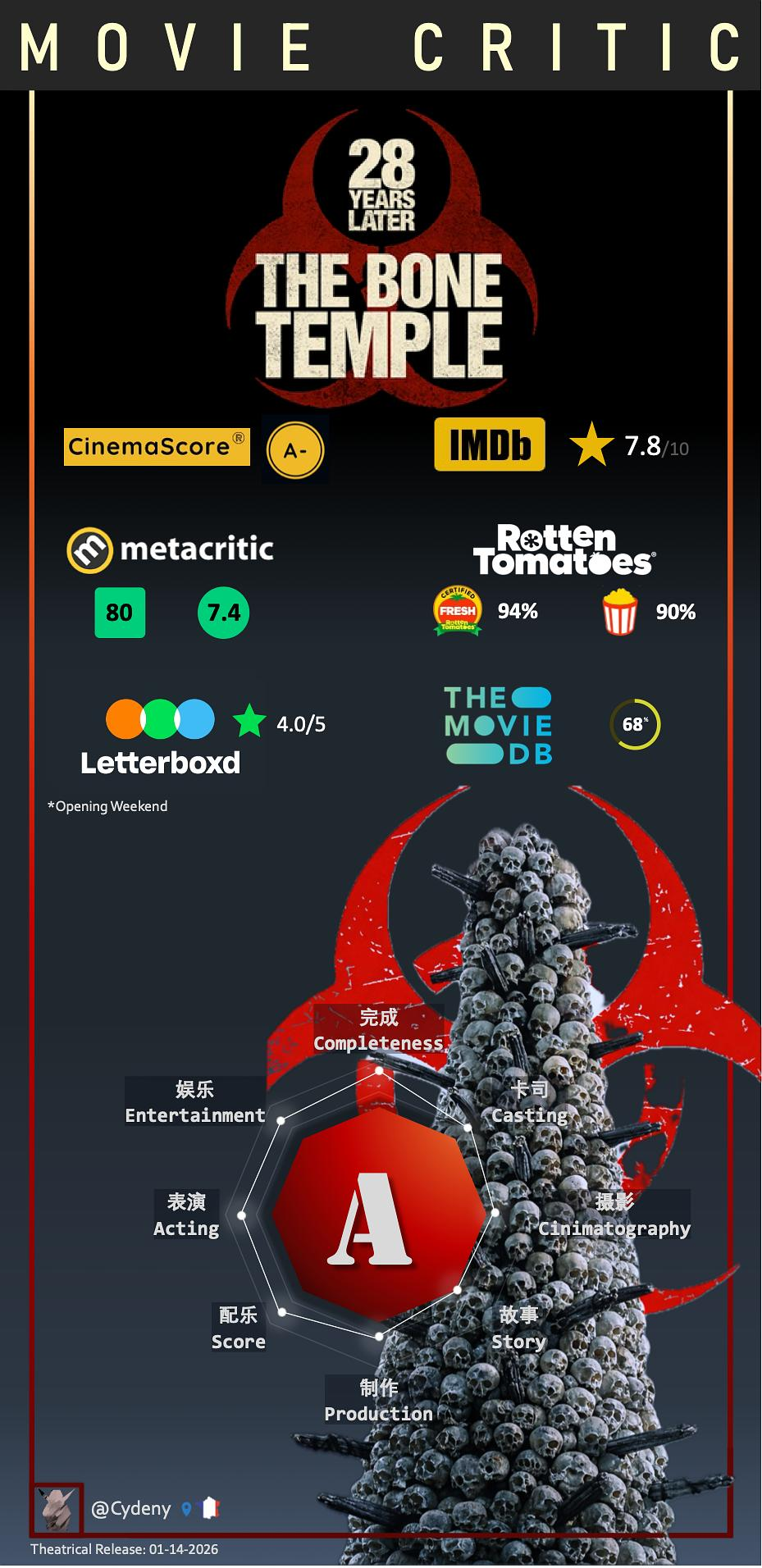 它试图把丧尸片重新变成一面社会镜子,照见流行文化如何在危机中被邪教化,照见“白骨圣殿”如何在绝境中成为最后的伦理实践。它未必像《惊变28天》那样以一击命中的形式革新类型,但它把末世英国拍成一个仍在持续自我解构的文化现场。
