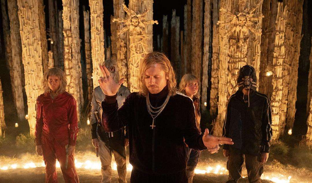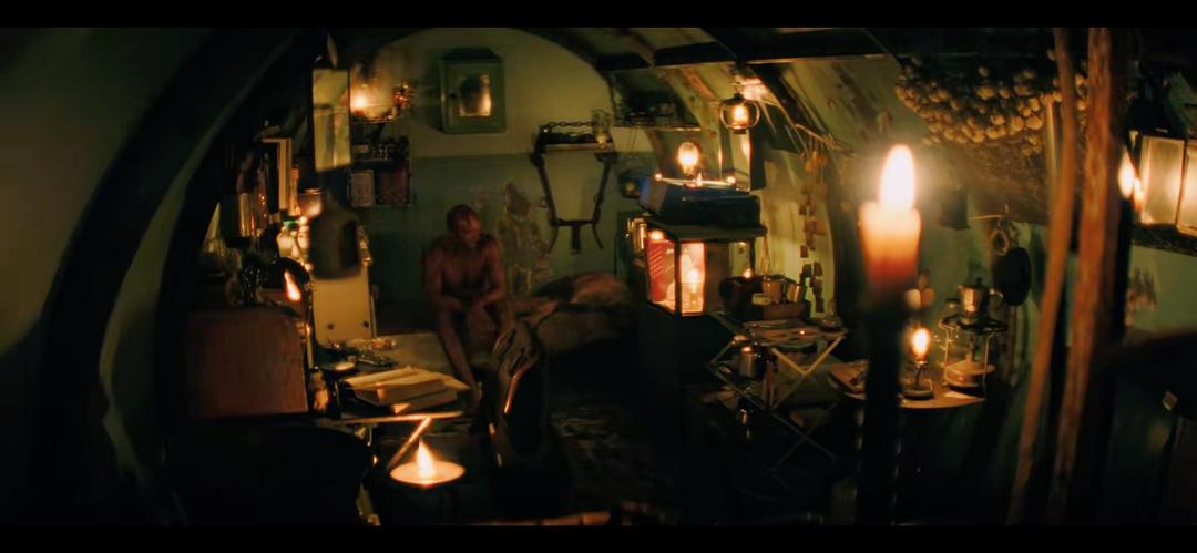于是整部影片最精彩的高潮片段来了:白骨殿堂森森白骨、点点火光闪烁其中,医生在高放的黑暗摇滚的衬托下旋转登场、给众人吹了迷幻剂后又表演一出火壶。在物质和精神都极度匮乏的后丧尸时代,一群没见识的小年轻惊为天人,死死信奉这就是撒旦本尊。