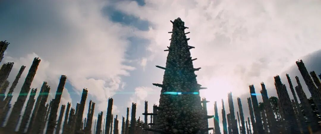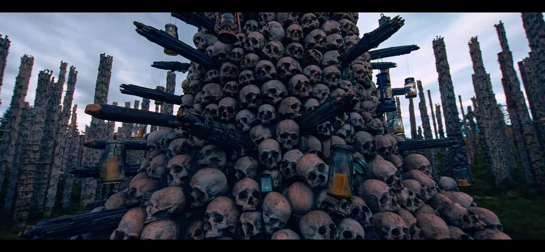 场景设计师卡森·麦科尔与加雷斯·普更在英国北约克郡的雷德迈尔真实搭建了这座庞大的“白骨圣殿”。这座建筑并非简单的道具堆砌,而是参考了英国古代帕根文化中的亨格(Henge)结构。