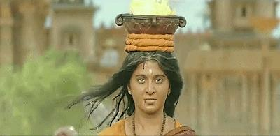 最后,在替巴霍巴利王复仇的过程中,她更是担当着儿子和义军的精神支柱,头顶火盆,走向仇人,亲手点燃了烧死仇敌的火焰。