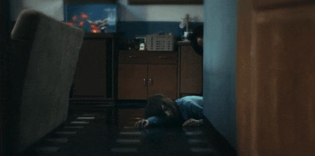 母亲趴在地上,双眼未闭。父亲则从墙后探出半张脸,眼里闪着光,嘴角微微上扬,仿佛在享受这份扭曲的“成就”。