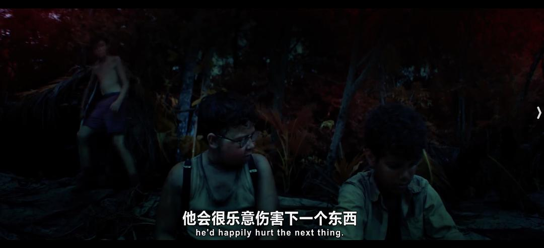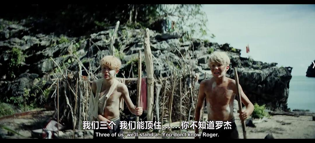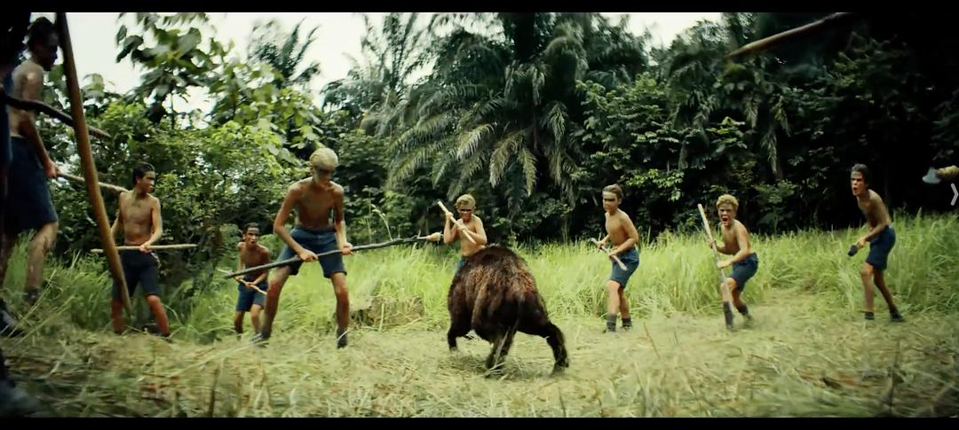 值得一提的是,杰克还有一个首席打手罗杰,他是比杰克更凶残的狠角色。最开始,他的邪恶还是捉弄、恐吓年龄更小的孩子。后来他们围猎了一头野猪,尝到血的滋味后,他便兽性大发,会去鼓动凶残猎杀,甚至虐杀同伴。男孩猪仔的不幸就是他直接造成的。