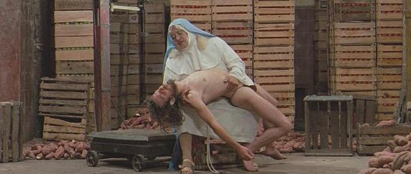 在集会上,小偷被引诱扛起十字架,之后被烈酒灌醉进行倒模,头戴蓝色丝巾的假圣母怀抱没有意识的小偷,构图暗合经典宗教场景《圣母哀恸》,然而圣母嘴角嘲讽的笑暗示被利用而不自知的小偷。
