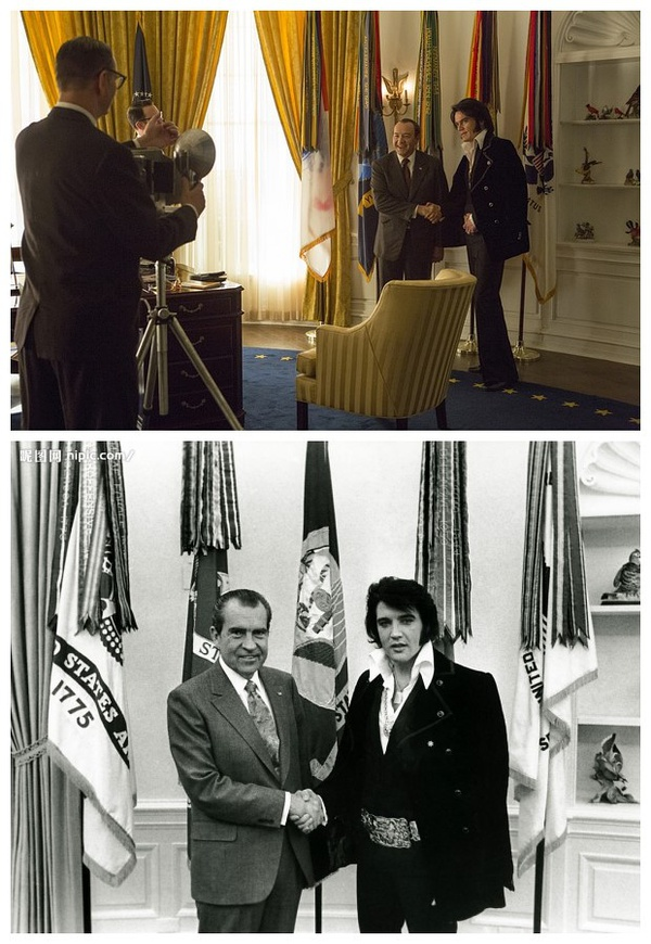 要把一张照片扩展成一部一个半小时的长片,除了挖掘背后的故事,饱和角色形象之外,一定程度的剧情上的夸张也是必要的。所以我们看到了一个郁郁寡欢也忧国忧民的猫王,一个顽固不化却爱女如命的尼克松,我们看到了猫王为了见尼克松费尽周折,而当两人真的在椭圆办公室相遇时,尼克松却显得有些拘谨。你可以说这些改编和史实略有出入,但对于这样一个夸张的故事,一对夸张的人物来说,即便不是真实的故事,也是观众想看到的故事,满足了观众对这次会面的遐想就足够了。