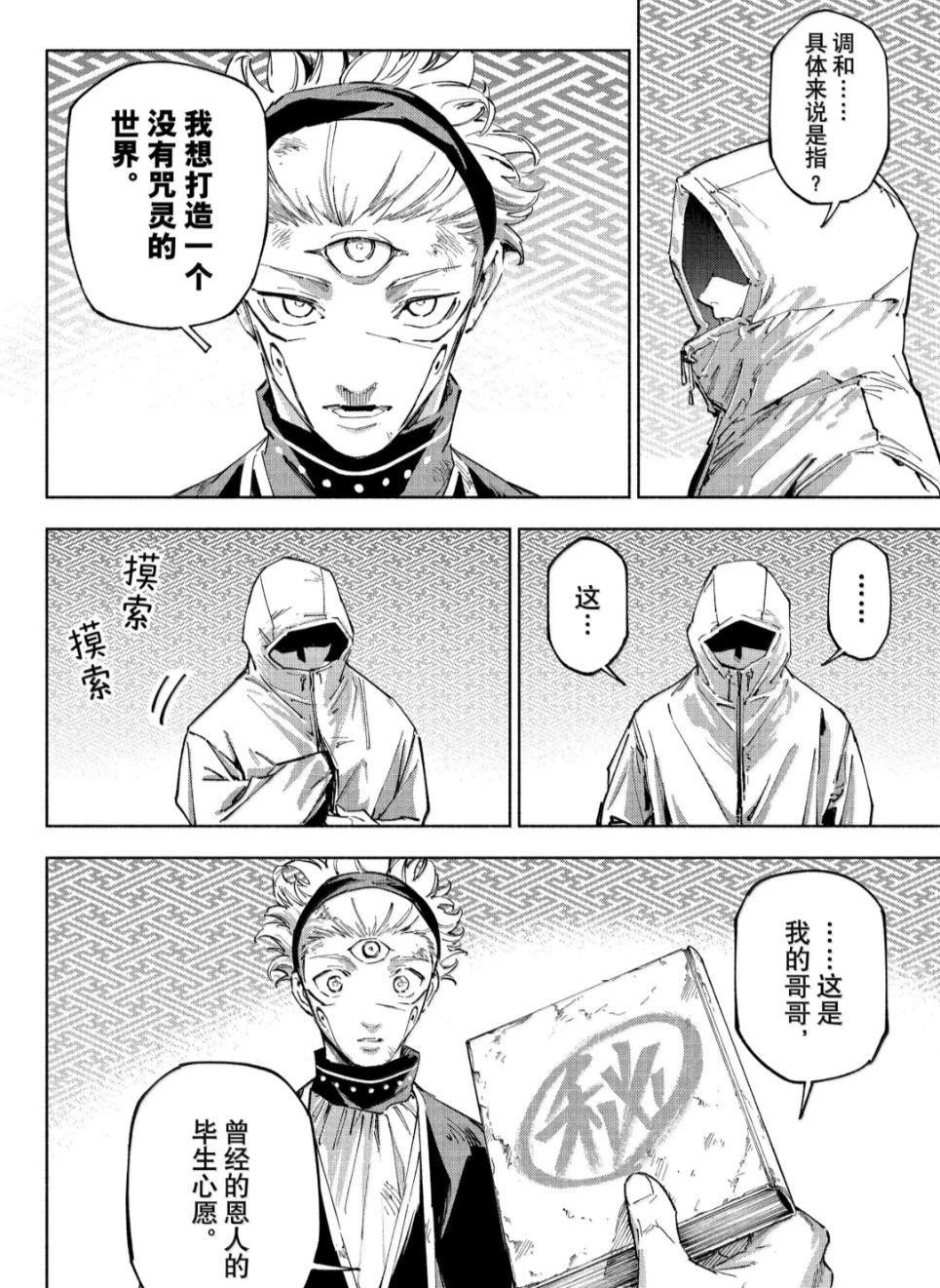 如同咒术回战死灭回游,新宿决战是对千年前羂索,宿傩所处的平安时代的延续,咒术回战≡是对68年前咒术回战情节的延续,这就是“回战”的含义。nn当虎杖拿出了九十九由基留下的灵魂研究笔记交给马鲁时,或许也说明了,在如何可以没有咒灵这一咒术回战最核心的问题上,九十九由基的答案,可能是正解。