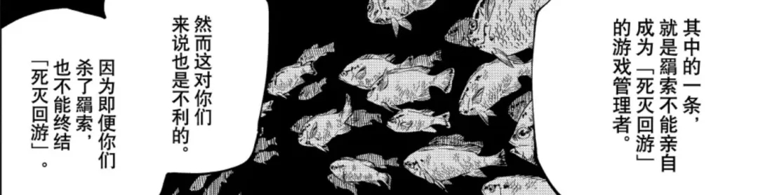 虎杖在这里特别强调了一句,在咒术中,跨过河川具有重要的意义,就是指在这个仪式中,游过海到达彼岸的结界边界非常重要。在到达之后,日本人就会以一种咒力形态,或者别的什么,回到天元的形态上,这就是回游,按照“咒术回战”的说法,也就是完成了普通人和天元的同化。nn或者说,死灭回游,按照其设定可以通俗理解为将日本人消灭变成咒力计划。nn我们再往下分析死灭回游的意思。回游,就是指生物学名词洄游,主要是指鱼类为了进行繁殖或者是觅食进行长距离的迁移。最著名的洄游,就是指鲑鱼或者鳗鱼回到它们出生的地方进行繁殖。nn而在漫画中,芥见下下在解释回游时,画的应该就是鲑鱼。