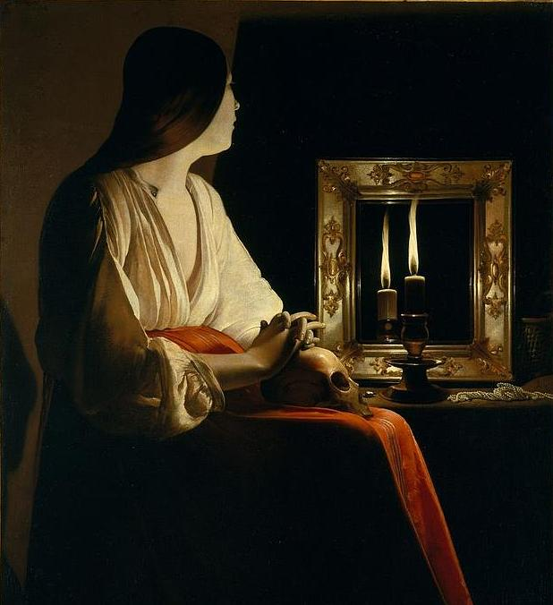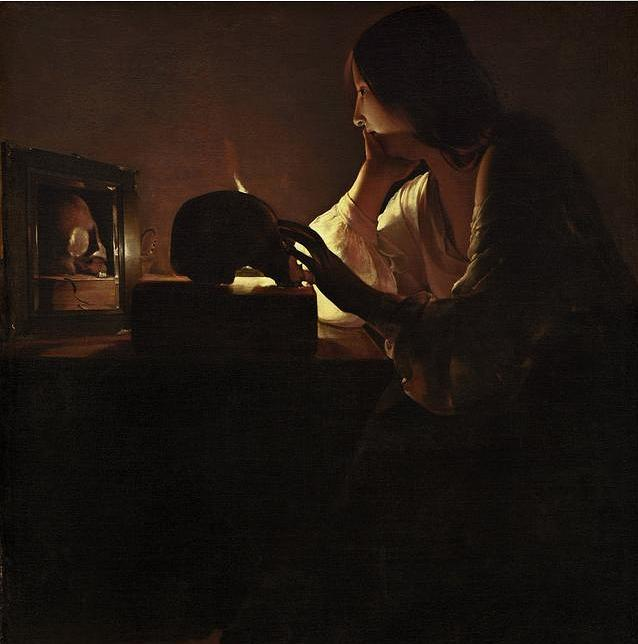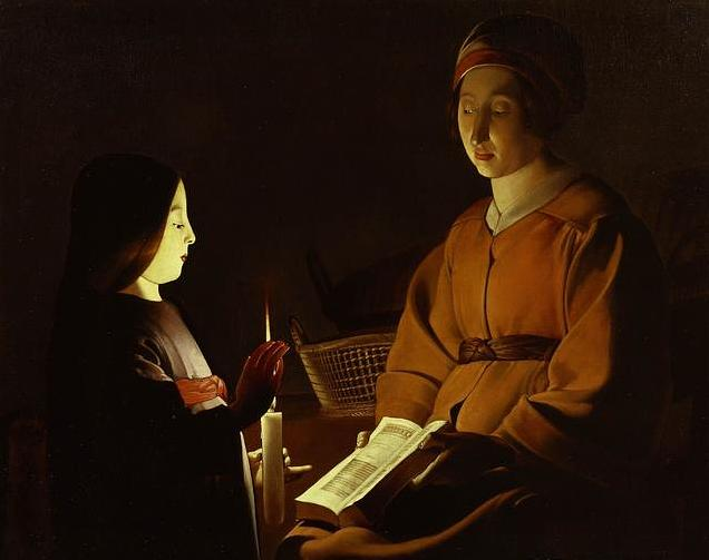 B,室内烛光。参考图拉尔!(描绘烛光、油灯或不可知的发光光源,对象受光部明亮,背景深褐,明暗对比强烈。成熟运用烛光控制色彩明度)暖色调。在大片黑暗色块衬托下,微弱的光线变的耀眼。