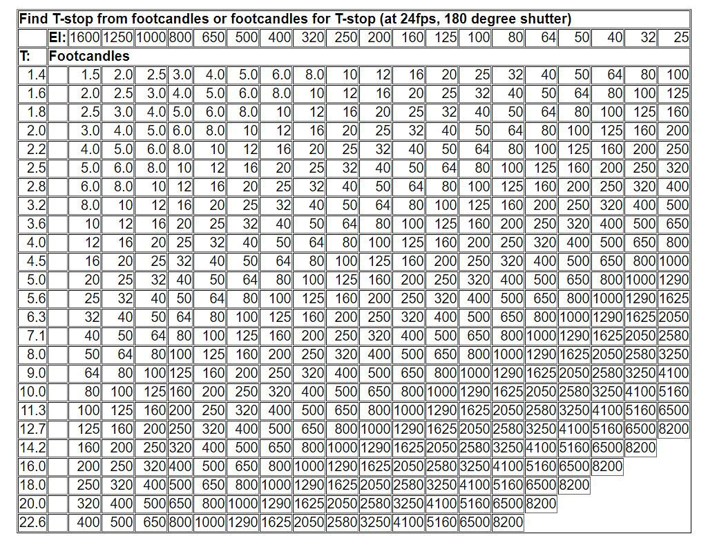 如果我们对照一下下方这张曝光表,可以看到,一个3英尺烛光的主光可在光圈T1.4,曝光指数(EI)800的情况下正确曝光。这放在今天已经不成问题了,因为许多数字摄影机的原生EI就是800,而且现在我们也已经有了蔡司Master定焦和Super Speeds这样的快速镜头。