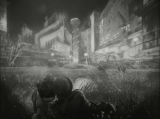 但即便在美学和技巧上颇有建树,电影却有一个容易被人忽视的潜文本,也是电影或者旅美导演茂瑙在影片中无意透露出的矛盾或冲突。主角三人的三角恋故事,流转在“城市”与“乡村”之间。乡村是丈夫的“出轨”直至对妻子“谋杀”的场所。而当谋杀未遂,夫妻一同辗转来到城市,城市的五光十色便迅速让二人和好如初、信守当初婚姻许下的诺言。电影为描刻“城市的夜景”此刻达到前所未有的极致斑斓和理想。然而这一夜过后,电影又急转直下——返回乡村的夫妻二人遭受到生与死的灾难。电影这几下生硬的转折、明显的分裂感,一直持续直到影片最后朦胧的日出。