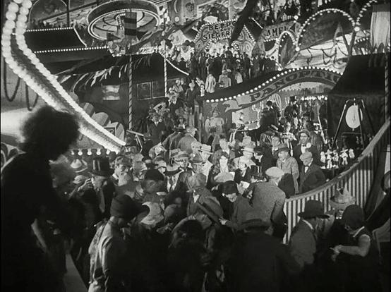 而细心的人也不难看到Murnau在《日出》中确实是更看重电影的视觉维度而非叙事维度。例证有二。第一,不用说那些范例一样的镜头调度,就连偶尔出现的字幕也被Murnau调动了起来。让这些字母来夸张的表演,真是不放过一丝能够用视觉表现的可能性。第二,从叙事的角度来说,《日出》绝对不是一个好故事,更绝非好莱坞化Central Conflict的故事。影片从夫妻二人进入城市到回到家中,剧情可以说是完全没有推进,而且人物的很多表现反应和动机也很值得商榷。这些是完全不符合好莱坞编剧规范的。在这样松散的故事框架中,Murnau极尽表现过程中的美好与欢乐,而尽量弱化了叙事,他就是这样让自己的电影去好莱坞化的。