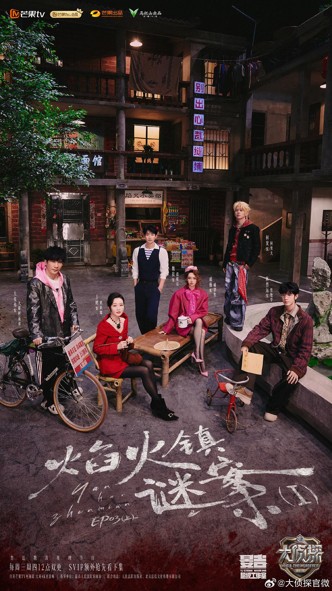 20260304第三期:焰火镇迷案Ⅰ。嘉宾:侦探大张伟,嫌疑人何炅、王鸥、魏晨、戚薇、陈哲远6位。从谍战文物片转移进校园霸凌群,唯一的笑点是何炅下一嗓子陈哲远蹲下之前还给了大张伟肚子一拳。陈哲远的胳膊不知道是造型还是受伤,录制期间一直吊着护具。最后集中讨论何老师一直往王鸥身上甩锅啊,就是没人相信,到了二讨时候其他人嫌疑都排掉了,只能是网友大学生何炅了。除了侦探两票错误外,其他四人全部成功获得一枚徽章。