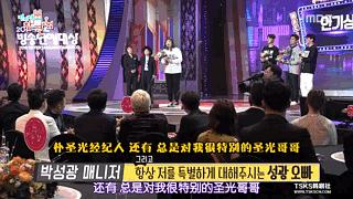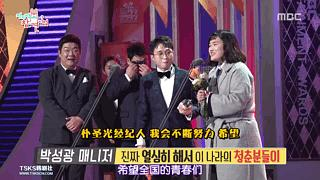 35集 终于跨年了他们全部去参加mbc年末演艺大赏 李英子获得了大赏 哈哈 恭喜恭喜 现在又回到全盛时期了 哈哈 她和经纪人都获得了奖 哈哈 高兴腾了 经纪人 真的好老练 哈哈 朴圣光和小松也得了最佳情侣奖 哈哈 朴圣光好紧张期待的 哈哈 然后所有经纪人得了人气奖 哈哈 比艺人得的奖还多 朴圣光 柳炳宰和梁世炯三个小矮人去表演了防弹少年的舞哇 还蛮整齐的 就是朴圣光的话筒掉了 有点可惜
