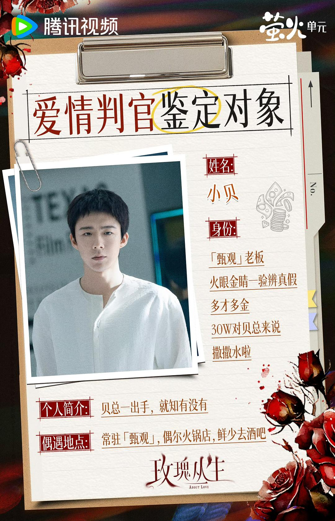 n在《玫瑰丛生》的世界里,几乎所有人物都在情感中摇摆、试探、自欺欺人。 有人用“真爱”合理化背叛,有人用怀疑验证爱情,有人在欲望与责任之间反复横跳。几乎所有人物都显得混乱、挣扎、失控,只有小贝,干净、克制、清醒到近乎冷漠。他是这爱情乱世中唯一的净土,混沌关系里唯一的光,犹如一个审视所有人自我暴露的旁观者。nn很多观众会误以为,小贝被放在旁观者位置,是作者并不偏爱的角色。但恰恰相反。纵观原著,小贝反而是被描写得最具体、最稳定的人。其他角色拥有复杂欲望,而小贝拥有清晰生活:明确的职业环境、稳定的日常节奏、完整的价值观。如果说老宫代表的是现实中会犯错、会自我辩护的男性,是现实男性的平均值,那么小贝更像作者写下的另一种可能,他是作者希望成为的人,是理想中完美的男性状态:有底线,有原则,有清醒的三观,不被情绪裹挟,不被欲望左右。作者一边通过老宫理解人性的软弱,一边又借小贝之口不断拆穿这种自我辩护。这种矛盾写法,本身就像一次自我对话:既承认真实,又不愿放弃正确。