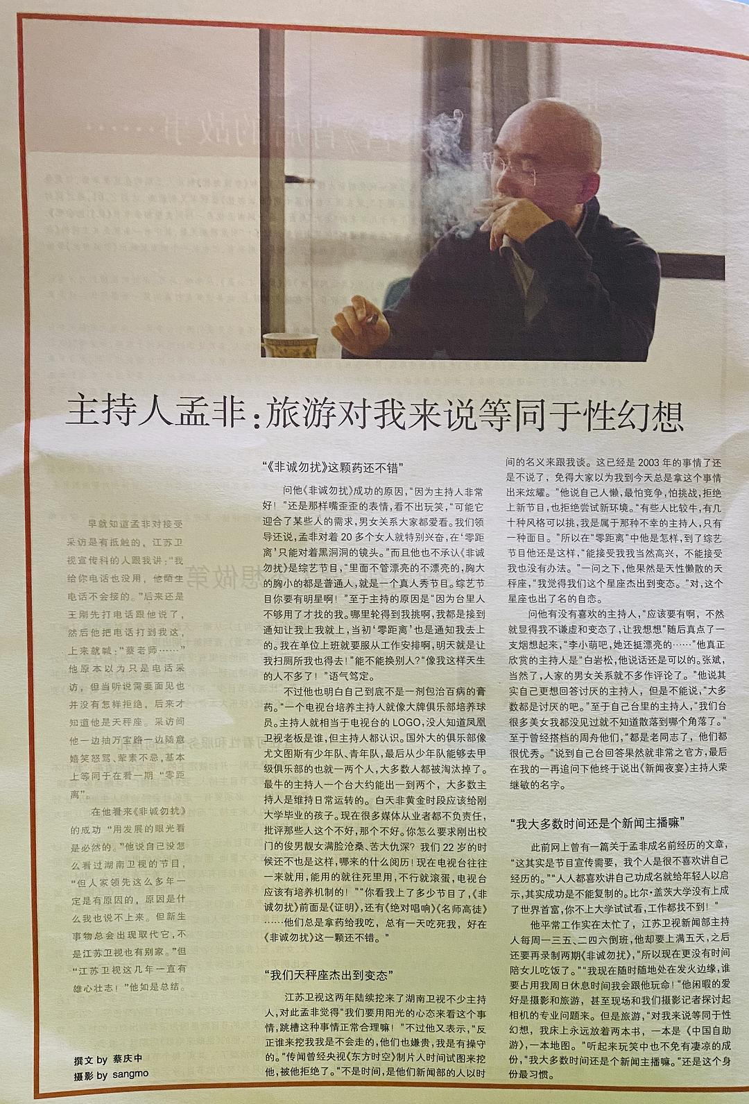 我记得采访时孟非一手捧着个老干部茶杯,一手夹着万宝路香烟,吞云吐雾,妙语连珠。他说:“因为台里人不够用了才找的我,哪里轮到我挑节目啊,我都是接到通知让我上就上……我在单位上班就要服从工作安排啊,明天就是让我扫厕所我也得去!”