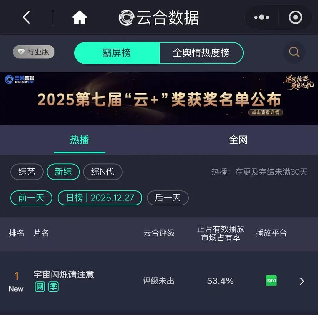爆笑氛围之下,“宇宙爆闪团”默契互动的诸多名场面迅速出圈,节目热度高开疯走,坐稳2026开年爆综宝座。截至目前,《宇宙闪烁请注意》已在云合、骨朵、灯塔、艺恩、猫眼、vlinkage等多个第三方数据平台的热度榜单上登顶,不仅拿下云合1月综艺霸屏榜TOP1和21个日冠,还在骨朵综艺热度指数排行榜上斩获25个日冠,此外根据灯塔数据,其全网正片播放市占率一度接近17%。